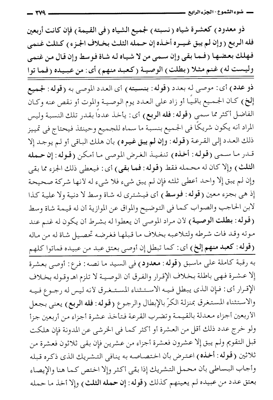 ذو معدود) كعشرة شياه (نسبته) لجميع الشياه (في القيمة) فإن كانت أربعين فله الربع (وإن لم يبق غيره أخذه إن حمله الثلث بخلاف الجزء) كثلث غنمي فهلك بعضها (فما بقي وإن سمي من لا شياه له شاة فوسط وإن قال من غنمي وليست له) غنم مثلا (بطلت) الوصية (كعبد منهم) أي: من عبيده (فماتوا