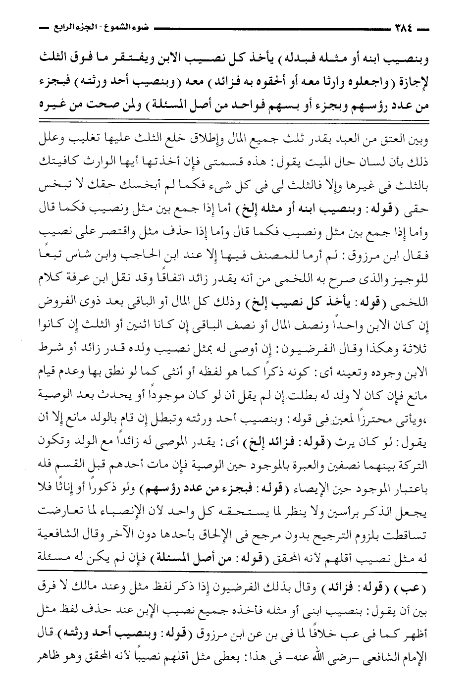 (عب) (قوله: فزائد) وقال بذلك الفرضيون إذا ذكر لفظ مثل وعند مالك لا فرق بين أن يقول: بنصيب ابني أو مثله فأخذه جميع نصيب الابن عند حذف لفظ مثل أظهر كما في عب خلافاً لما في بن عن ابن مرزوق (قوله: وبنصيب أحد ورثته) قال الإمام الشافعي – رضي الله عنه – في هذا: يعطي مثل أقلهم نصيباً لأنه المحقق وهو ظاهر