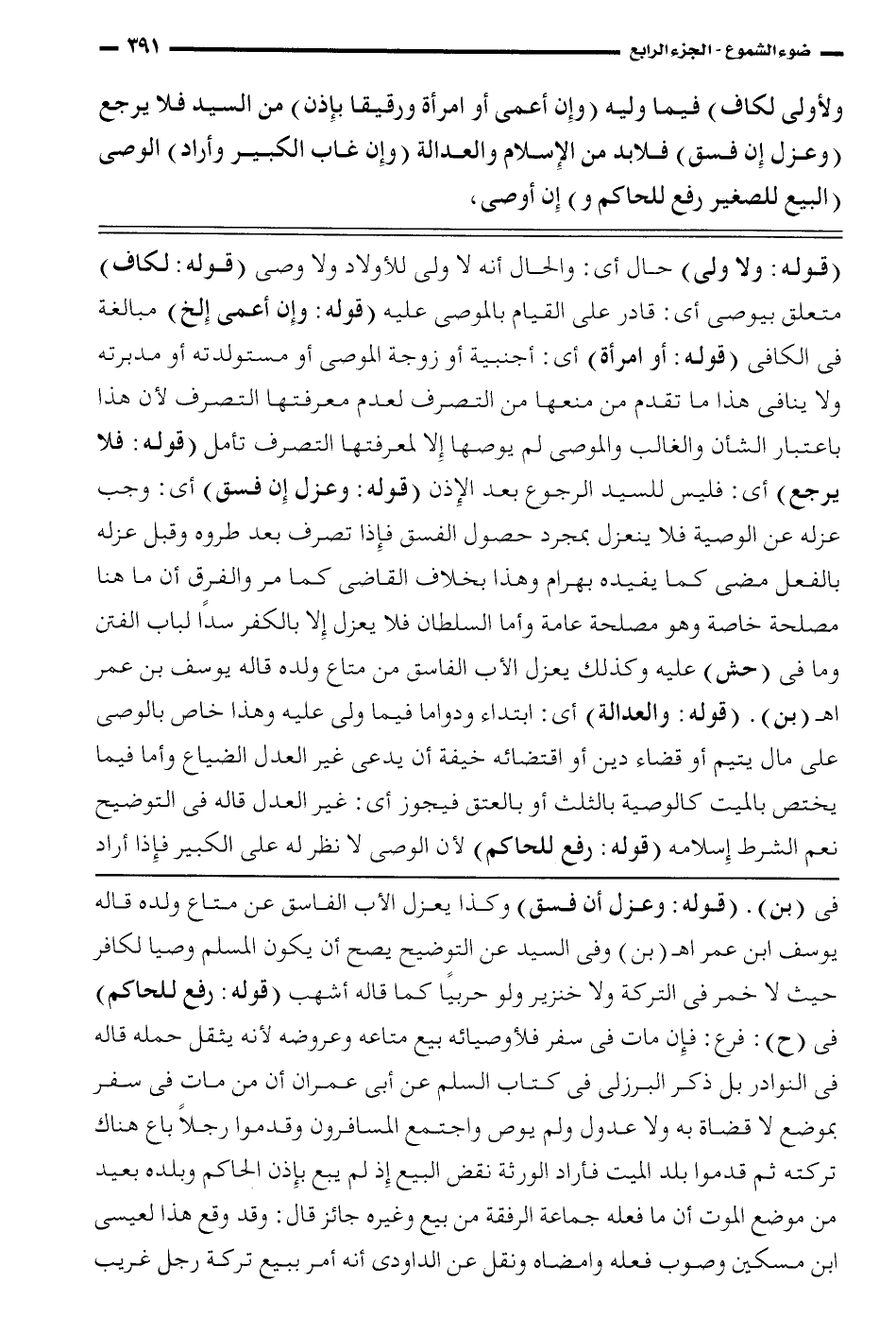 ولأولى لكاف) فيما وليه (وإن أعمى أو امرأة ورقيقاً بإذن) من السيد فلا يرجع (وعزل إن فسق) فلابد من الإسلام والعدالة (وإن غاب الكبير وأراد) الوصي (البيع للصغير رفع للحاكم و) إن أوصى،