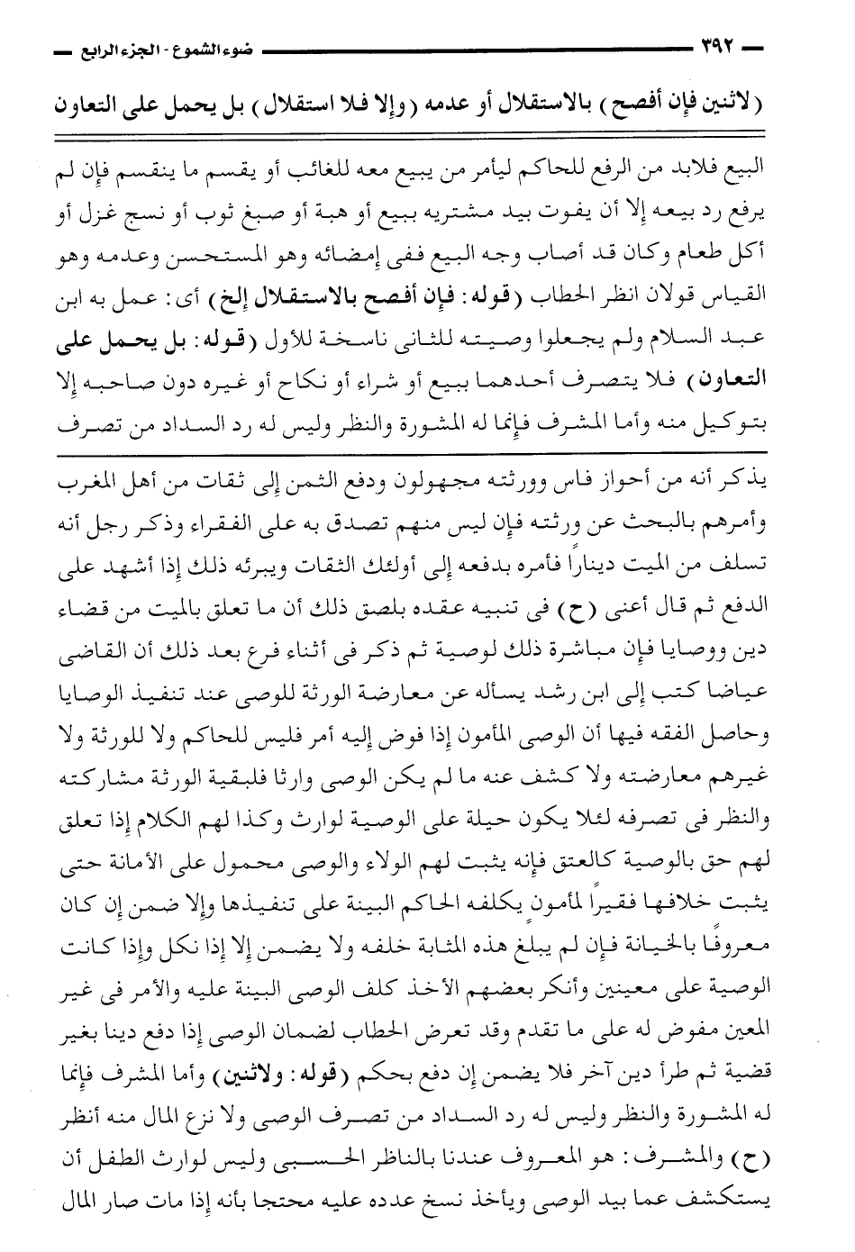 البيع فلابد من الرفع للحاكم ليأمر من يبيع معه للغائب أو يقسم ما ينقسم فإن لم يرفع رد بيعه إلا أن يفوت بيد مشتريه ببيع أو هبة أو صبغ ثوب أو نسج غزل أو أكل طعام وكان قد أصاب وجه البيع ففي إمضائه وهو المستحسن وعدمه وهو القياس قولان انظر الحطاب (قوله: فإن أفصح بالاستقلال إلخ) أي: عمل به ابن عبد السلام ولم يجعلوا وصيته للثاني ناسخة للأول (قوله: بل يحمي على التعاون) فلا يتصرف أحدهما ببيع أو شراء أو نكاح أو غيره دون صاحبه إلا بتوكيل منه وأما المشرف فإنما له المشورة والنظر وليس له رد السداد من تصرف