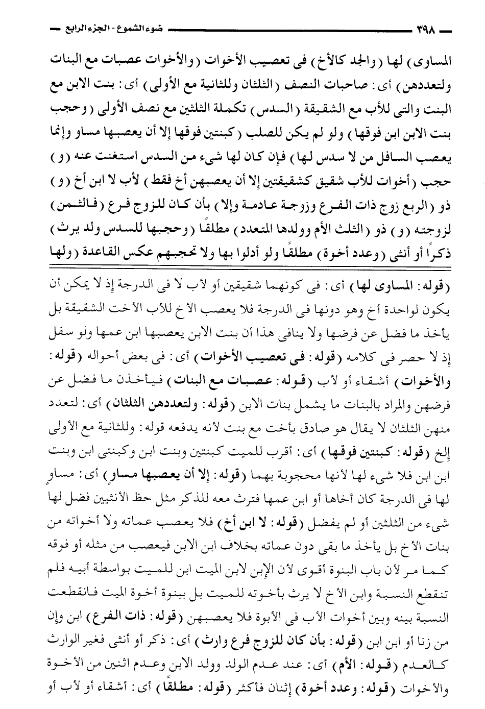 المساوي) لها (والجد كالأخ) في تعصيب الأخوات (والأخوات عصبات مع البنات ولتعددهن) أي: صاحبات النصف (الثلثان وللثانية مع الأولى) أي: بنت الابن مع البنت والتي للأب مع الشقيقة (السدس) تكملة الثلثين مع نصف الأولى (وحجب بنت الابن ابن فوقها) ولو لم يكن للصلب (كبنتين فوقها إلا أن يعصبها مساو وإنما يعصب السافل من لا سدس لها) فإن كان لها شيء من السدس استغنت عنه (و) حجب (أخوات للأب شقيق كشقيقتين إلا أن يصعبهن أخ فقط) لأب لا ابن أخ (و) ذو (الربع زوج ذات الفرع وزوجة عادمة وإلا) بأن كان للزوج فرع (فالثمن) لزوجته (و) ذو (الثلث الأم وولدها المتعدد) مطلقاً (وحجبها للسدس ولد يرث) ذكراً أو أنثى (وعدد أخوة) مطلقاً ولو أدلوا بها ولا تحجبهم عكس القاعدة (ولها