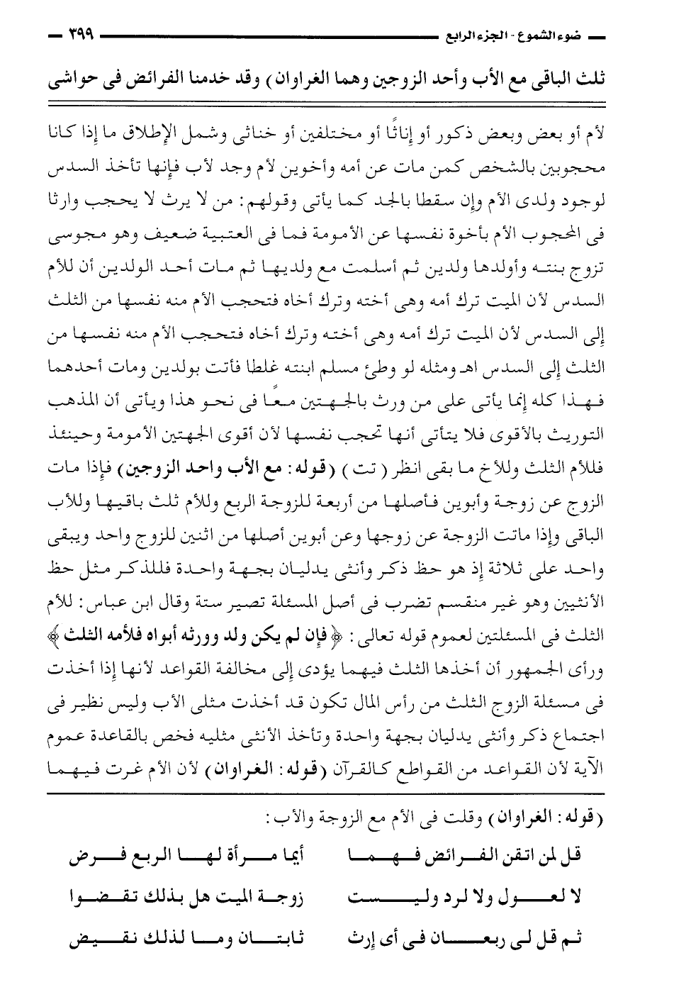 (قل لمن اتقن الفرائض فهما ... أيما امرأة لها الربع فرض)