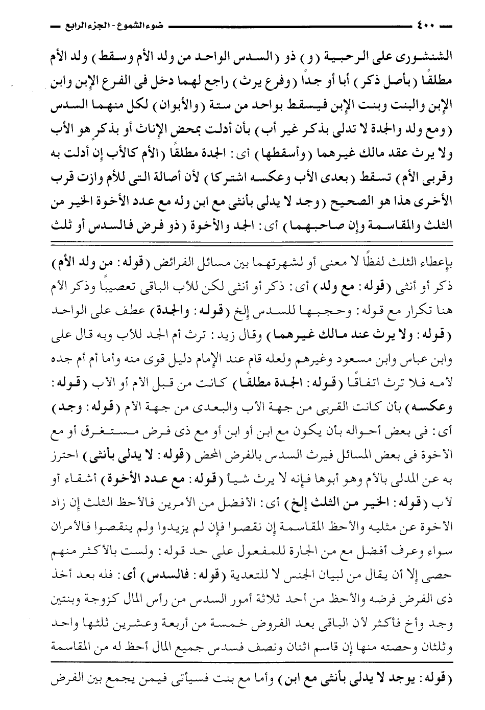 الشنشوري على الرحبية (و) ذو (السدس الواحد من ولد الأم وسقط) ولد الأم مطلقاً (بأصل ذكر) أباً أو جداً (وفرع يرث) راجع لهما دخل في الفرع الابن وابن الابن والبنت وبنت الابن فيسقط بواحد من ستة (والأبوان) لكل منهما السدس (ومع ولد والجدة لا تدلي بذكر غير أب) بأن أدلت بمحض الإناث أو بذكرٍ هو الأب ولا يرث عقد مالك غيرهما (وأسقطهما) أي: الجدة مطلقاً (الأم كالأب إن أدلت به وقربى الأم) تسقط (بعدي الأب وعكسه اشتركا) لأن أصالة التي للأم وازت قرب الأخرى هذا هو الصحيح (وجد لا يدلى بأنثى مع ابن وله مع عدد الأخوة الخير من الثلث والمقاسمة وإن صاحبهما) أي: الجد والأخوة (ذو فرض فالسدس أو ثلث