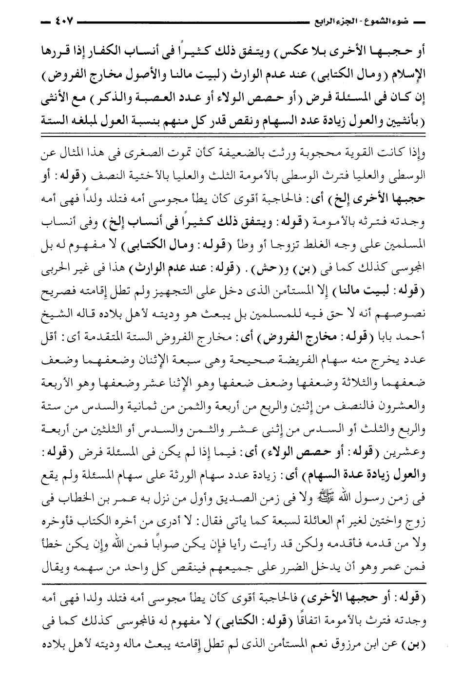أو حجبها الأخرى بلا عكس) ويتفق ذلك كثيراً في أنساب الكفار إذا قررها الإسلام (ومال الكتابي) عند عدم الوارث (لبيت مالنا والأصول مخارج الفروض) إن كان في المسئلة فرض (أو حصص الولاء عدد العصبة والذكر) مع الأنثى (بأنثيين والعول زيادة عدد السهام ونقص قدر كل منهم بنسبة العول لمبلغه الستة