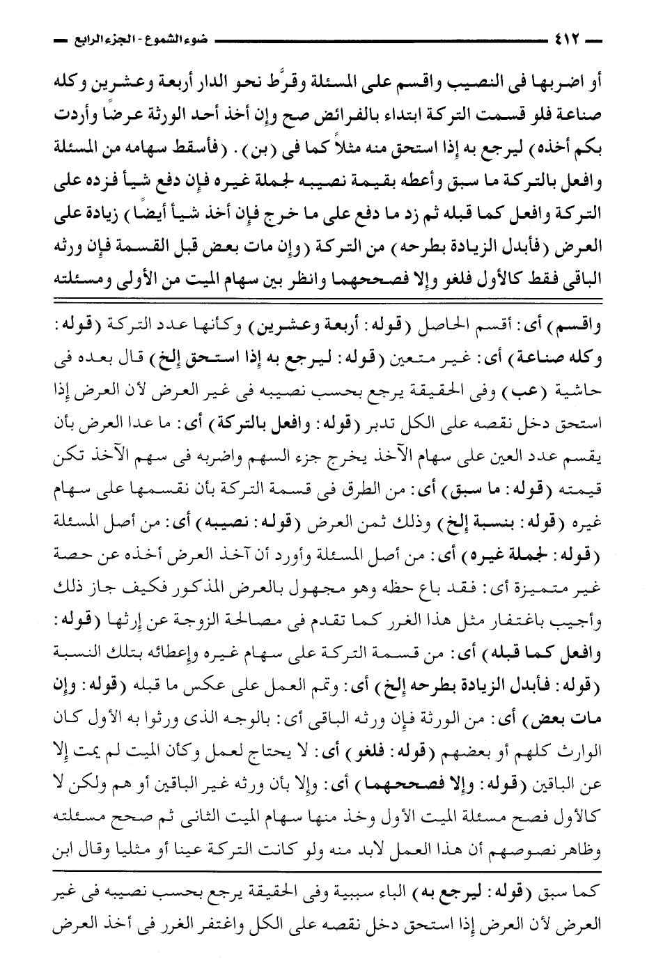 أو اضربها في النصيب واقسم على المسئلة وقرَّط نحو الدار أربعة وعشرين وكله صناعة فلو قسمت التركة ابتداء بالفرائض صح وإن أخذ أحد الورثة عرضاً وأردت بكم أخذه) ليرجع به إذا استحق منه مثلاً كما في (بن). (فأسقط سهامه من المسئلة وافعل بالتركة ما سبق واعطه بقيمة نصيبه لجملة غيره فإن دفع شيئاً فزده على التركة وافعل كما قبله ثم زد ما دفع على ما خرج فإن أخذ شيئاً أيضاً) زيادة على العرض (فأبدل الزيادة بطرحه) من التركة (وإن مات بعض قبل القسمة فإن ورثه الباقي فقط كالأول فلغو وإلا فصححهما وانظر بين سهام الميت من الأولى ومسئلته