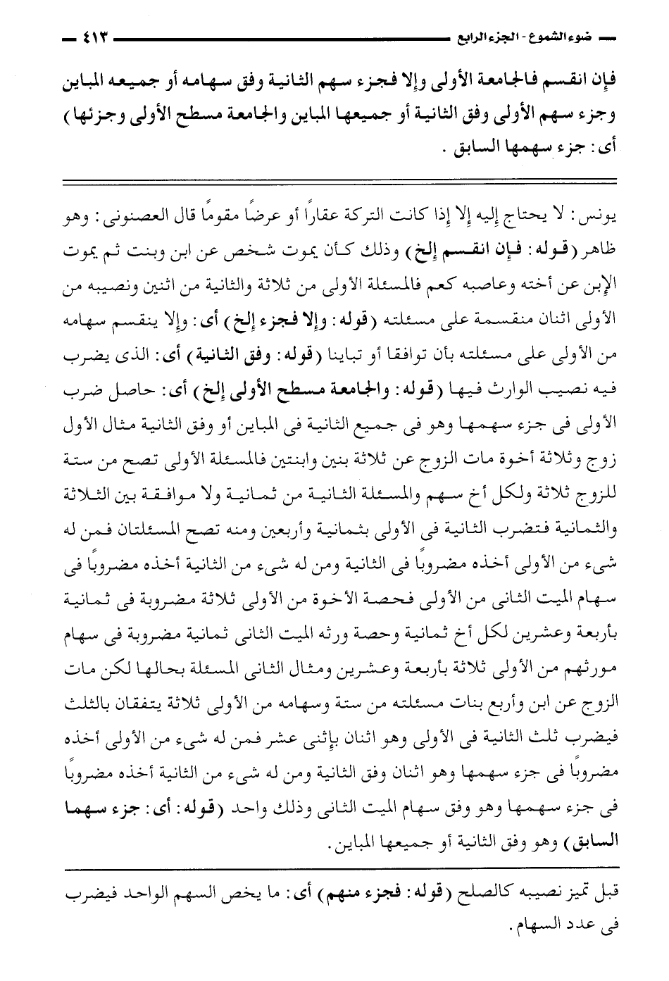 يونس: لا يحتاج إليه إلا إذا كانت التركة عقاراً أو عرضاً مقوماً قال العصنوني: وهو ظاهر (قوله: فإن انقسم الخ) وذلك كأن يموت شخص عن ابن وبنت ثم يموت الابن عن أخته وعاصبه كعم فالمسألة الأولى من ثلاثة والثانية من اثنين ونصيبه من الأولى اثنان منقسمة على مسئلته (قوله: وإلا فجزء الخ) أي: وإلا ينقسم سهامه من الأولى على مسئلته بأن توافقا أو تباينا (قوله: وفق الثانية) أي: الذي يضرب فيه نصيب الوارث فيها (قوله: والجامعة مسطح الأولى الخ) أي: حاصر ضرب الأولى في جزء سهمها وهو في جميع الثانية في المباين أو وفق الثانية مثال الأول زوج وثلاثة أخوة مات الزوج عن ثلاثة بنين وابنتين فالمسئلة الأولى تصح من ستة للزوج ثلاثة ولكل أخ سهم والمسئلة الثانية من ثم انية ولا موافقة بين الثلاثة والثمانية فتضرب الثانية في الأولى بمثانية وأربعين ومنه تصح المسئلتان فمن له شيء من الأولى أخذه مضروباً في الثانية ومن له شيء من الثانية أخذه مضروباً في سهام الميت الثاني من الأولى فحصة الأخوة من الأولى ثلاثة مضروبة في ثمانية بأربعة وعشرين لكل أخ ثمانية وحصة ورثة الميت الثاني ثمانية مضروبة في سهام موروثهم من الأولى ثلاثة بأربعة وعشرين ومثال الثاني المسئلة بحالها لكن مات الزوج عن ابن وأربع بنات مسئلته من ستة وسهامه من الأولى ثلاثة فتقان بالثلث فيضرب ثلث الثانية في الأولى وهو اثنان باثني عشر فمن له شيء من الأولى أخذه مضروباً في جزء سهمها وهو اثنان وفق الثانية ومن له شيء من الثانية أخذه مضروباً في جزء سهمها وهو وفق سهام الميت الثاني وذلك واحد (قوله: أي: جزء سهما السابق) وهو وفق الثانية أو جميعها المباين.