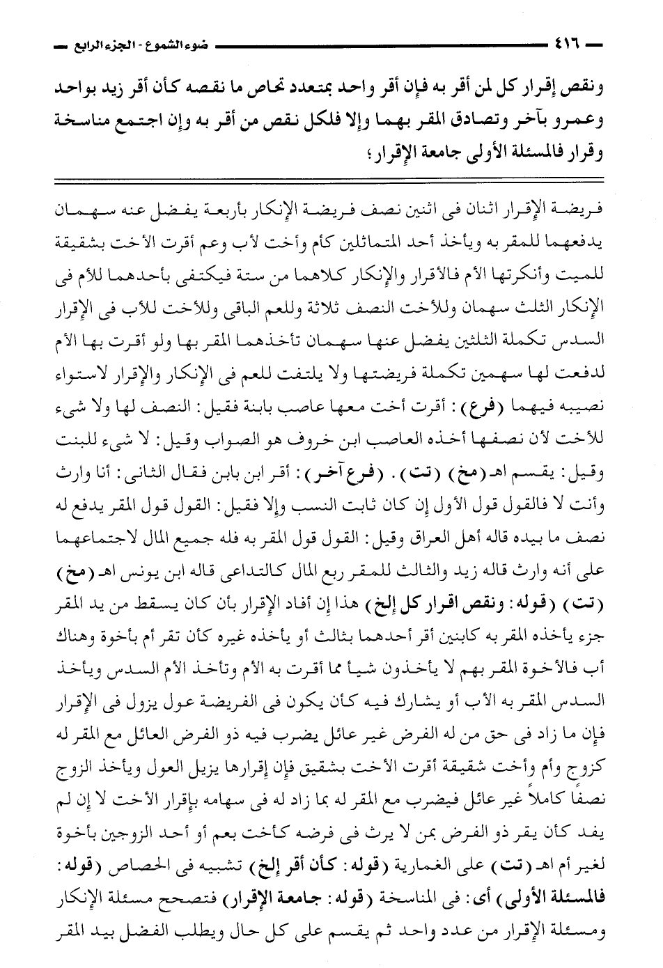 فريضة الإقرار اثنان في اثنين نصف فريضة الإنكار بأربعة يفضل عنه سهمان يدفعهما للمقر به ويأخذ أحد المتماثلين كأم وأخت لأب وعم أقرت الأخت بشقيقة للميت وأنكرتها الأم فالإقرار والإنكار كلاهما من ستة فيكتفى بأحدهما للأم في الإنكار الثلث سهمان وللأخت النصف ثلاثة وللعم الباقي وللأخت للأب في الإقرار السدس تكملة الثلثين يفضل عنها سهمان تأخذهما المقر بها ولو أقرت بها الأم لدفعت لها سهمين تكملة فريضتها ولا يلتفت للعم في الإنكار والإقرار لاستواء نصيبه فيهما (فرع): أقرت أخت معها عاصب بابنة فقيل: النصف لها ولا شيء للأخت لأن نصفها أخذه العاصب ابن خروف هو الصواب وقيل: لا شيء للبنت وقيل: يقسم اهـ (مخ) (تت). (فرع آخر): أقر ابن بابن فقال الثاني: أنا وارث وأنت لا فالقول قول الأول إن كان ثابت النسب وإلا فقيل: القول قول المقر يدفع له نصف ما بيده قاله أهل العراق وقيل: القول قول المقر به فله جميع المال لاجتمعاهما على أنه وارث قاله زيد والثالث للمقر ربع المال كالتداعي قاله ابن يونس اهـ (مخ) (تت) (قوله: ونقص إقرار كل الخ) هذا إن أفاد الإقرار بأن كان يسقط من يد المقر جزء يأخذه المقر به كابنين أقر أحدهما بثالث أو يأخذه غيره كأن تقر أم بأخوة وهناك أب فالأخوة المقر بهم لا يأخذون شيئاً مما أقرت به الأم وتأخذ الأم السدس ويأخذ السدس المقر به الأب أو يشارك فيه كأن يكون في الفريضة عول يزول في الإقرار فإن ما زاد في حق من له الفرض غير عائل يضرب فيه ذو الفرض العائل مع القمر له كزوج وأم وأخت شقيقة أقرت الأخت بشقيق فإن إقرارها يزيل العول ويأخذ الزوج نصفاً كاملاً غير عائل فيضرب مع المقر له بما زاد له في سهامه بإقرار الأخت لا إن لم يفد كأن يقر ذو الفرض بمن لا يرث في فرضه كأخت بعم أو أحد الزوجين بأخوة لغير أم اهـ (تت) على الغمارية (قوله: كان أقر الخ) تشبيه في الحصاص (قوله: فالمسألة الأولى) أي: في المناسخة (قوله: جامعة الإقرار) فتصحح مسألة الإنكار ومسألة الإقرار من عدد واحد ثم يقسم على كل حال ويطلب الفضل بيد المقر