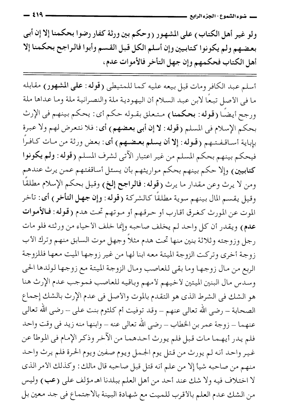 أسلم عبد الكافر ومات قبل بيعه عليه كما للمتيطى (قوله: على المشهور) مقابلة ما في الأصل تبعاً لابن عبد السلام أن اليهودية ملة والنصرانية ملة وما عداها ملة ورجح أيضاً (قوله: بحكمنا) متعلق بقوله حكم أي: يحكم بينهم في الإرث بحكم الإسلام في المسلم (قوله: لا إن أبى بعضهم) أي: فلا نتعرض لهم ولا عبرة بإباية أساقفتهم (قوله: إلا أن يسلم بعضهم) أي: بعض ورثة من مات كافراً فيحكم بينهم بحكم المسلم من غير اعتبار الآتي لشرف المسلم (قوله: ولم يكونوا كتابيين) وإلا حكم بينهم بحكم مواريثهم بأن يسئل أساقفتهم عمن يرث عندهم ومن لا يرث وعن مقدار ما يرث (قوله: فالراجح الخ) وقيل بحكم الإسلام مطلقاً وقيل يقسم المال بينهم سوية مطلقاً كالشراكة (قوله: وإن جهل التأخر) أي: تأخر الموت عن المورث كغرق أقارب أو حرقهم أو موتهم تحت هدم (قوله: فالأموات عدم) ويقدر أن كل واحد لم يخلف صاحبه وإنما خلف الأحياء من ورثته فلو مات رجل وزوجته وثلاثة بنين منها تحت هدم مثلاً وجهل موت السابق منهم وترك الأب زوجة أخرى وتركت الزوجة الميتة معه ابنا لها من غير زوجها الميت معها فللزوجة الربع من مال زوجها وما بقي للعاصب ومال الزوجة الميتة مع زوجها لولدها الحي وسدس مال البنين الميتين لأخيهم لأمهم وباقية للعاصب فموجب عدم الإرث هنا هو الشك في الشرط الذي هو التقدم بالموت والأصل في عدم الإرث بالشك إجماع الصحابة – رضي الله عنهم – وقد توفيت أم كلثوم بنت علي – رضي الله تعالى عنهما – زوجة عمر بن الخطاب – رضي الله تعالى عنه – وابنها منه زيد في وقت واحد فلم يدر أيهما مات قبل فلم يورث أحدهما من الآخر وذكر الإمام في الموطأ عن غير واحد أنه لم يورث من قتل يوم الجمل ويوم صفين ويوم الحرة فلم يرث واحد منهم من صاحبه شيأ إلا من علم أنه قتل قبل صاحبه قال مالك: وكذلك الأمر الذي لا اختلاف فيه ولا شك عند أحد من أهل العلم ببلدنا اهـ مؤلف على (عب) وليس من الشك عدم العلم بالأقرب للميت مع شهادة البينة بالاجتماع في جد معين بل