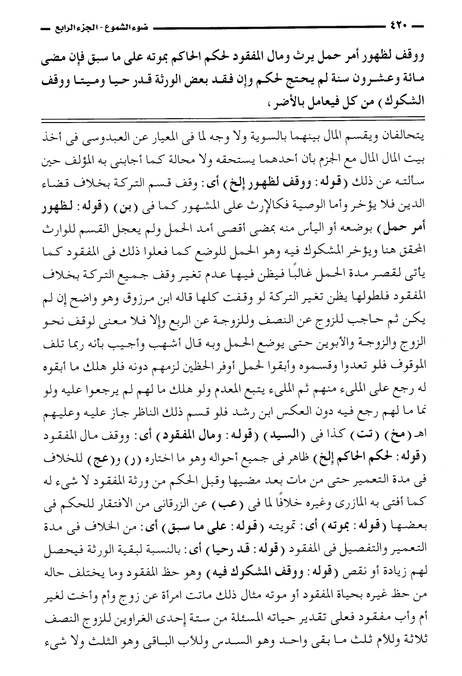 ووقف لظهور أمر حمل يرث ومال المفقود لحكم الحاكم بموته على ما سبق فإن مضى مائة وعشرون سنة لم يحتج لحكم وإن فقد بعض الورثة قدر حياً وميتاً ووقف الشكوك) من كل فيعامل بالأضر،