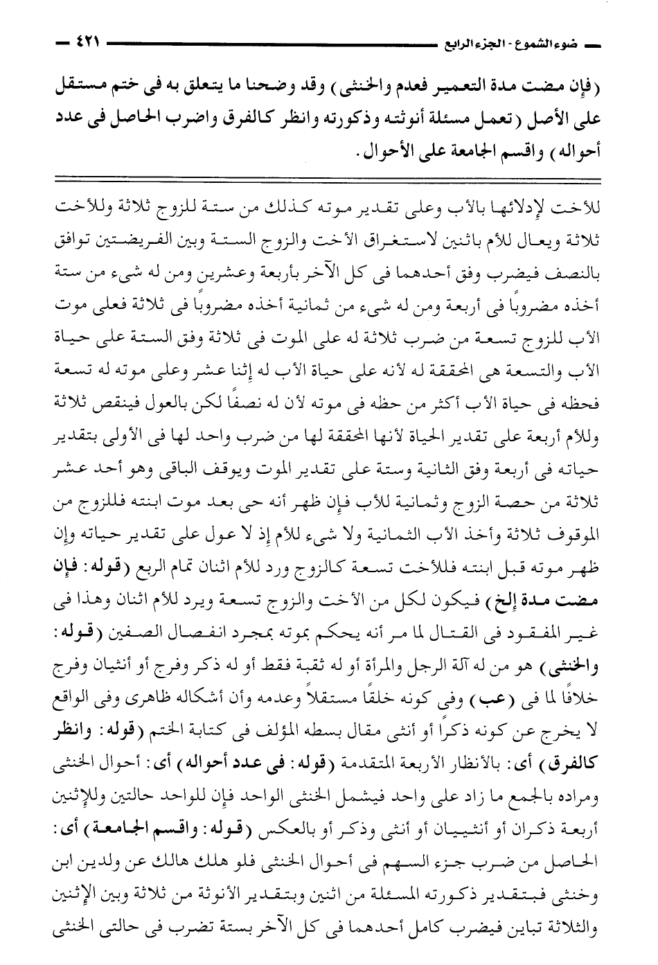(فإن مضت مدة التعمير فعدم والخنثى) وقد وضحنا ما يتعلق به في ختم مستقل على الأصل (تعمل مسألة أنوثته وذكورته وانظر كالفرق واضرب الحاصل في عدد أحواله) واقسم الجامعة على الأحوال.