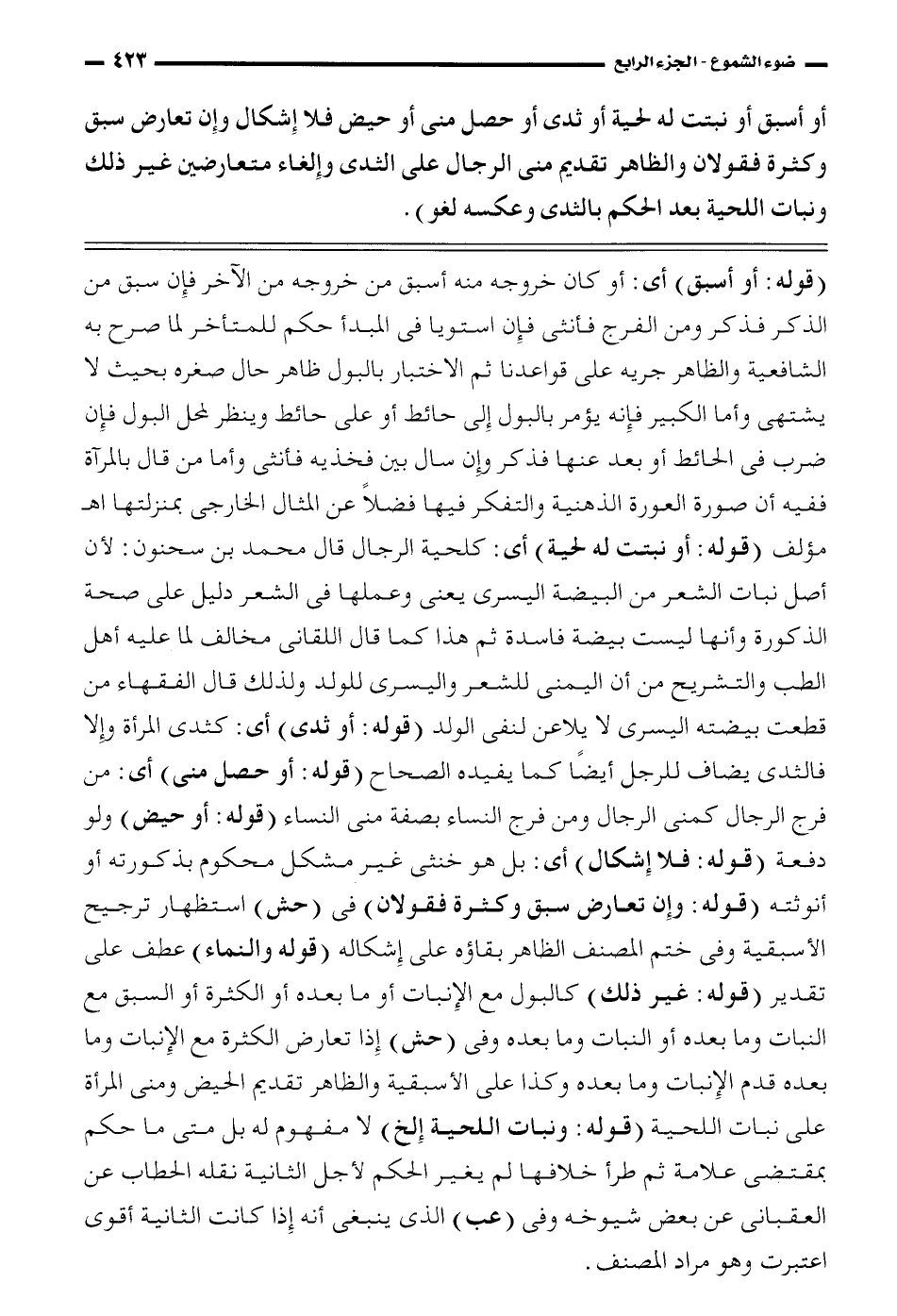 (قوله: أو أسبق): أو كان خروجه منه أسبق من خروجه من الآخر فإن سبق من الذكر فذكر ومن الفرج فأنثى فإن استويا في المبدأ حكم للمتأخر لما صرح به الشافعية والظاهر جريه على قواعدنا ثم الاختيار بالبول ظاهر حال صغره بحيث لا يشتهي وأما الكبير فإنه يؤمر بالبول إلى حائط أو على حائط وينظر لمحل البول فإن ضرب في الحائط أو بعد عنها فذكر وإن سال بين فخذيه فأنثى وأما من قال بالمرآة ففيه أن صورة العورة الذهنية والتفكر فيها فضلاً عن المثال الخارجي بمنزلتها اهـ مؤلف (قوله: أو نبتت له لحية) أي: كلحية الرجال قال محمد بن سحنون: لأن أصل نبات الشعر من البيضة اليسرى يعني وعملها في الشعر دليل على صحة الذكورة وأنها ليست بيضة فاسدة ثم هذا كما قال اللقاني مخالف لما عليه أهل الطب والتشريح من أن اليمني للشعر واليسرى للولد ولذلك قال الفقهاء من قطعت بيضته اليسرى لا يلاعن لنفي الولد (قوله: أو ثدي) أي: كثدي المرأة وإلا فالثدي يضاف للرجل أيضاً كما يفيده الصحاح (قوله: أو حصل منى) أي: من فرج الرجال كمنى الرجال ومن فرج النساء بصفة منى النساء (قوله: أو حيض) ولو دفعة (قوله: فلا إشكال) أي: بل هو خنثى غير مشكل محكوم بذكورته أو أنوثته (قوله: وإن تعارض سبق وكثرة فقولان) في (حش) استظهار ترجيح الأسبقية وفي ختم المصنف الظاهر بقاؤه على إشكاله (قوله والنماء) عطف على تقدير (قوله: غير ذلك) كالبول مع الإنبات أو ما بعده أو الكثرة أو السبق مع النبات وما بعده أو النبات وما بعده وفي (حش) إذا تعارض الكثرة مع الإنبات وما بعده قدم الإنبات وما بعده وكذا على الأسبقية والظاهر تقديم الحيض ومنى المرأة على نبات اللحية (قوله: ونبات اللحية إلخ) لا مفهوم له بل متى ما حكم بمقتضى علامة ثم طرأ خلافها لم يغير الحكم لأجل الثانية نقله الحطاب عن العقباني عن بعض شيوخه وفي (عب) الذي ينبغي أنه إذا كانت الثانية أقوى اعتبرت وهو مراد المصنف.