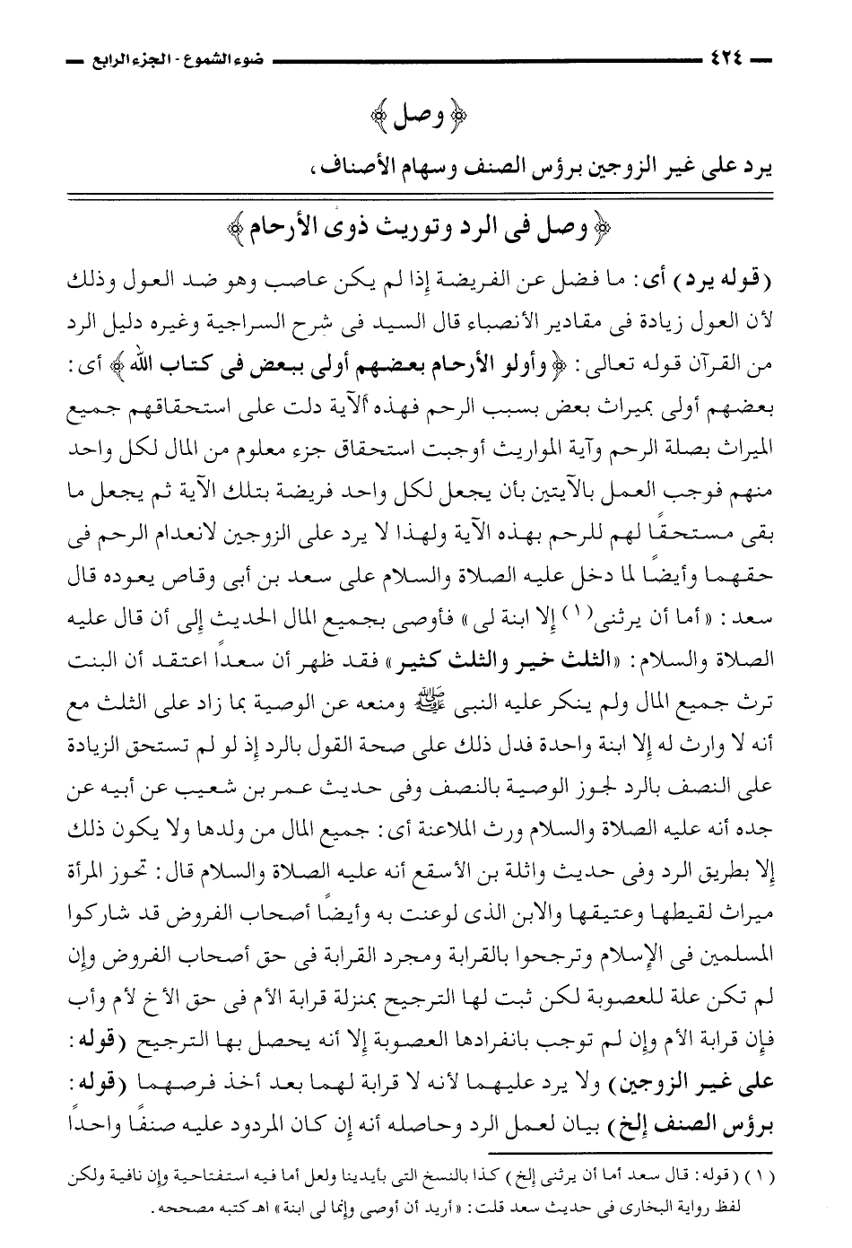 (قوله يرد) أي: ما فضل عن الفريضة إذا لم يكن عاصب وهو ضد العول وذلك لأن العول زيادة في مقادير الأنصباء قال السيد في شرح السراجية وغيره دليل الرد من القرآن قوله تعالى: {وأولو الأرحام بعضهم أولى ببعض في كتاب الله} أي: بعضهم أولى بميراث بعض بسبب الرحم فهذه الآية دلت على استحقاقهم جميع الميراث بصلة الرحم وآية المواريث أوجبت استحقاق جزء معلوم من المال لكل واحد منهم فوجب العمل بالآيتين بأن يجعل لكل واحد فريضة بتلك الآية ثم يجعل ما بقى فوجب العمل بالآيتين بأن يجعل لكل واحد فريضة بتلك الآية ثم يجعل ما بقى مستحقاً لهم للرحم بهذه الآية ولهذا لا يرد على الزوجين لانعدام الرحم في حقهما وأيضاً لما دخل عليه الصلاة والسلام على سعد بن أبي وقاص يعوده قال سعد: "أما أن يرثني إلا ابنة لي" فأوصى بجميع المال الحديث إلى أن قال عليه الصلاة والسلام: "الثلث خير والثلث كثير" فقد ظهر أن سعداً اعتقد أن البنت ترك جميع المال ولم ينكر عليه النبي - صلى الله عليه وسلم - ومنعه عن الوصية بما زاد على الثلث مع أنه لا وارث له إلا ابنة واحدة فدل ذلك على صحة القول بالرد إذ لو لم تستحق الزيادة على النصف بالرد لجوز الوصية بالنصف وفي حديث عمر بن شعيب عن أبيه عن جده أنه عليه الصلاة والسلام ورث الملاعنة أي: جميع المال من ولدها ولا يكون ذلك إلا بطريق الرد وفي حديث واثلة بن الأسقع أنه عليه الصلاة والسلام قال: تحوز المرأة ميراث لقيطها وعتيقها والابن الذي لوعنت به وأيضاً أصحاب الفروض قد شاركوا المسلمين في الإسلام وترجحوا بالقرابة ومجرد القرابة في حق أصحاب الفروض وإن لم تكن علة للعصوبة لكن ثبت لها الترجيح بمنزلة قرابة الأم في حق الأخ لأم وأب فإن قرابة الأم وإن لم توجب بانفرادها العصوبة إلا أنه يحصل بها الترجيح (قوله: على غير الزوجين) ولا يرد عليهما لأنه لا قرابة لهما بعد أخذ فرضهما (قوله: برؤس الصنف إلخ) بيان لعمل الرد وحاصله أنه إن كان المردود عليه صنفاً واحداً