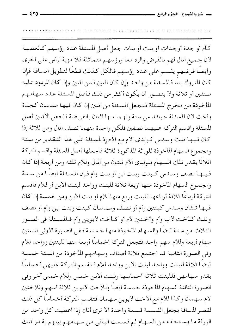 كأم أو جدة أو جدات أو بنت أو بنات جعل أصل المسألةعدد رؤسهم كالعصبة لأن جميع المال لهم بالفرض والرد معاً ورؤوسهم متماثلة فلا مزية لرأس على أخرى وأيضاً فرضهم يقسم على عدد رؤسهم فالكل كذلك قطعاً لتطويل المسافة فإن كان المتروك بنتاً فالمسألة من واحد وإن كان اثنين فمن اثنين وإن كان المردود عليه صنفين أو ثلاثة ولا يتصور أن يكون أكثر من ذلك فأصل المسألةعدد سهامهم المأخوذة من مخرج المسألةفتجعل المسألةمن اثنين إن كان فيها سدسان كجدة وأخت لأن المسألة حينئذ من ستة ولهما منها اثنان بالفريضة فاجعل الاثنين أصل المسألةواقسم التركة عليهما نصفين فلكل واحدة منها نصف المال ومن ثلاثة إذا كان فيها ثلث وسدس كولدي الأم مع الأم إذ لمسألةعلى هذا التقدير من ستة ومجموع السهام المأخوذة للورثة المذكورة ثلاثة فاجعلها أصل المسألةواقسم التركة أثلاثاً بقدر تلك السهام فلولدي الأم ثلثان من المال وللأم ثلثه ومن أربعة إذا كان فيها نصف وسدس كبنت وبنت وابن أو بنت وأم فإن المسألةأيضاً من ستة ومجموع السهام المأخوذة منها أربعة ثلاثة للبنت وواحد لبنت الابن أو للأم فاقسم التركة أربعاً ثلاثة أرباعها للبنت وربع منها للأم أو بنت الابن ومن خمسة إن كان فيها ثلثان وسدس كبنتين وأم أو نصف وسدسان كبنت وبنت ابن وأم أو نصف وثلث كأخت لأب وأم وأختين لأم أو كأخت لأبوين وأم فالمسألة في الصور الثلاث من ستة أيضاً والسهام المأخوذة منها خمسة ففي الصورة الأولى للبنتين سهام أربعة وللأم سهم واحد فتجعل التركة أخماساً أربعة منها للبنتين وواحد للأم وفي الصورة الثانية قد اجتمع ثلاثة أصناف وسهامهم المأخوذة من الستة خمسة أيضاً ثلاثة للبنت وواحد لبنت الابن وواحد للأم فتقسم التركة عليهم أخماساً بقدر سهامهن فللبنت ثلاثة أخماسها ولبنت الابن خمس وللأم خمس آخر وفي الصورة الثالثة السهام المأخوذة خمسة أيضاً وللأخت لأبوين ثلاثة أسهم وللأختين لأم سهمان وكذا للأم مع الأخت لأبوين سهمان فتقسم التركة أخماساً كل ذلك لقصر المسافة بجعل القسمة واحدة ألا ترى أنك إذا أعطيت كل واحد من الورثة ما يستحقه من السهام ثم قسمت الباقي من سهامهم بينهم بقدر تلك