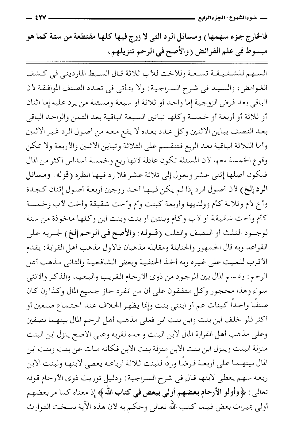 السهم للشقيقة تسعة وللأخت للأب ثلاثة قال السبط المارديني في كشف الغوامض، والسيد في شرح السراجية: ولا يتأتى في تعدد الصنف الموافقة لأن الباقي بعد فرض الزوجية إما واحد أو ثلاثة أو سبعة ومسألة من يرد عليه إما اثنان أو ثلاثة أو أربعة أو خمسة وكلها تباتين السبعة الباقية بعد الثمن والوحد الباقي بعد النصف يباين الاثنين وكل عدد بعده لا يقع معه من أصول الرد غير الاثنين وأما الثلاثة الباقية بعد الربع فتنقسم على الثلاثة وتباين الاثنين والأربعة ولا يمكن وقوع الخمسة معها لأن المسألة تكون عائلة لأنها ربع وخمسة أسداس أكثر من المال فيكون أصلها اثنى عشر وتعول إلى ثلاثة عشر فلا رد فيها انظره (قوله: ومسائل الرد إلخ) لأن أصول الرد إذا لم يكن فيها أحد الزوجين أربعة أصول اثنان كجدة وأخ لأم وثلاثة كأم وولديها وأربعة كبنت وأم وأخت شقيقة وأخت لأب وخمسة كأم وأخت شقيقة أو لأب وكأم وبنتين أو بنت وبنت ابن وكلها مأخوذة من ستة لوجود الثلث أو النصف والثلث (قوله: والأصح في الرحم إلخ) لجريه على القواعد وبه قال الجمهور والحنابلة ومقابله مذهبان فالأول مذهب أهل القرابة: يقدم الأقرب للميت على غيره وبه أخذ الحنفية وبعض الشافعية والثاني مذهب أهل الرحم: يقسم المال بين الموجود من ذوي الأرحام القريب والبعيد والذكر والأنثى سواء وهذا محجور وكل متفقون على أن من انفرد حاز جميع المال وكذا إن كان صنفاً واحداً كبنات عم أو ابنتي بنت وإنما يظهر الخلاف عند اجتماع صنفين أو أكثر فلو خلف ابن بنت وابن بنت ابن فعلى مذهب أهل الرحم المال بينهما نصفين وعلى مذهب أهل القرية المال لابن البنت وحده لقربه وعلى الأصح ينزل ابن البنت منزلة البنت وينزل ابن بنت الابن منزلة بنت الابن فكأنه مات عن بنت وبنت ابن المال بينهما على أربعة فرضاً ورداً للبنت ثلاثة أرباعه يعطي لابنها ولبنت الابن ربعه سهم يعطي لابنها قال في شرح السراجية: ودليل توريث ذوي الأرحام قوله تعالى: {وأولوا الأرحام بعضهم أولى ببعض في كتاب الله} إذ معناه كما مر بعضهم أولى بميراث بعض فيما كتب الله تعالى وحكم به لأن هذه الآية نسخت التوارث