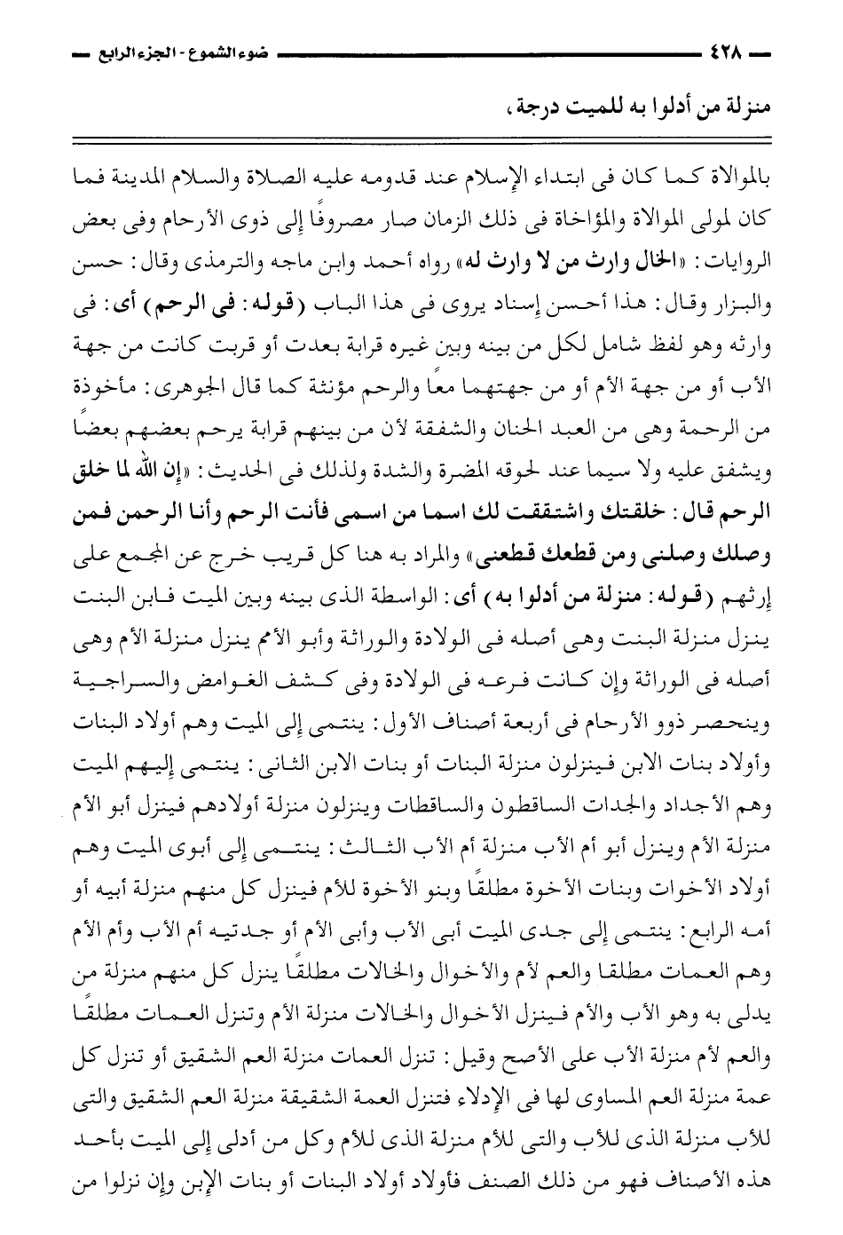 بالموالاة كما كان في ابتداء الإسلام عند قدومه عليه الصلاة والسلام المدينة فما كان لمولى الموالاة والمؤاخاة في ذلك الزمان صار مصروفاً إلى ذوي الأرحام وفي بعض الروايات: "الخال وارث من لا وارث له" رواه أحمد وابن ماجه والترمذي وقال: حسن والبزار وقال: هذا أحسن إسناد يروى في هذا الباب (قوله: في الرحم) أي: في وارثه وهو لفظ شامل لكل من بينه وبين غيره قرابة بعدت أو قربت كانت من جهة الأب أو من جهة الأم أو من جهتهما معاً والرحم مؤنثة كما قال الجوهري: مأخوذة من الرحمة وهي من العبد الحنان والشفقة لأن من بينهم قرابة يرحم بعضهم بعضاً ويشفق عليه ولاسيما عند لحوقه المضرة والشدة ولذلك في الحديث: "إن الله لما خلق الرحم قال: خلقتك واشتتققت لك اسماً من اسمي فأنت الرحم وأنا الرحمن فمن وصلك وصلني ومن قطعك قطعني" والمراد به هنا كل قريب خرج عن المجمع على إرثهم (قوله: منزلة من أدلوا به) أي: الواسطة الذي بينه وبين الميت فابن البنت ينزل منزلة البنت وهي أصله في الولادة والوراثة وأبو الأمم ينزل منزلة الأم وهي أصله في الوراثة وإن كانت فرعه في الولادة وفي كشف الغوامض والسراجية وينحصر ذوو الأرحام في أربعة أصناف الأول: ينتمي إلى الميت وهم أولاد البنات وأولاد بنات الابن فينزلون منزلة البنات أو بنات الابن الثاني: ينتمي إليهم الميت وهم الأجداد والجدات الساقطون والساقطات وينزلون منزلة أولادهم فينزل أبو الأم منزلة الأم وينزل أبو أم الأب منزلة أم الأب الثالث: ينتمي إلى أبوي الميت وهم أولاد الأخوات وبنات الأخوة مطلقاً وبنو الأخوة للأم فينزل كل منهم منزلة أبيه أو أمه الرابع: ينتمي إلى جدي الميت أبي الأب وأبي الأم أو جدتيه أم الأب وأم الأم وهم العمات مطلقاً والعم لأم والأخوال والخالات مطلقاً ينزل كل منهم منزلة من يدلي به وهو الأب والأم فينزل الأخوال والخالات مطلقاً ينزل كل منهم منزلة من يدلي به وهو الأب والأم فينزل الأخوال والخالات منزلة الأم وتنزل العمات مطلقاً والعم لأم منزلة الأب على الأصح وقيل: تنزل العمات منزلة العم الشقيق أو تنزل كل عمة منزلة العم المساوي لها في الإدلاء فتنزل العمة الشقيقة منزلة العم الشقيق والتي للأب منزلة الذي للأب والتي للأم منزلة الذي للأم وكل من أدلى إلى الميت بأحد هذه الأصناف فهو من ذلك الصنف فأولاد أولاد البنات أو بنات الابن وإن نزلوا من