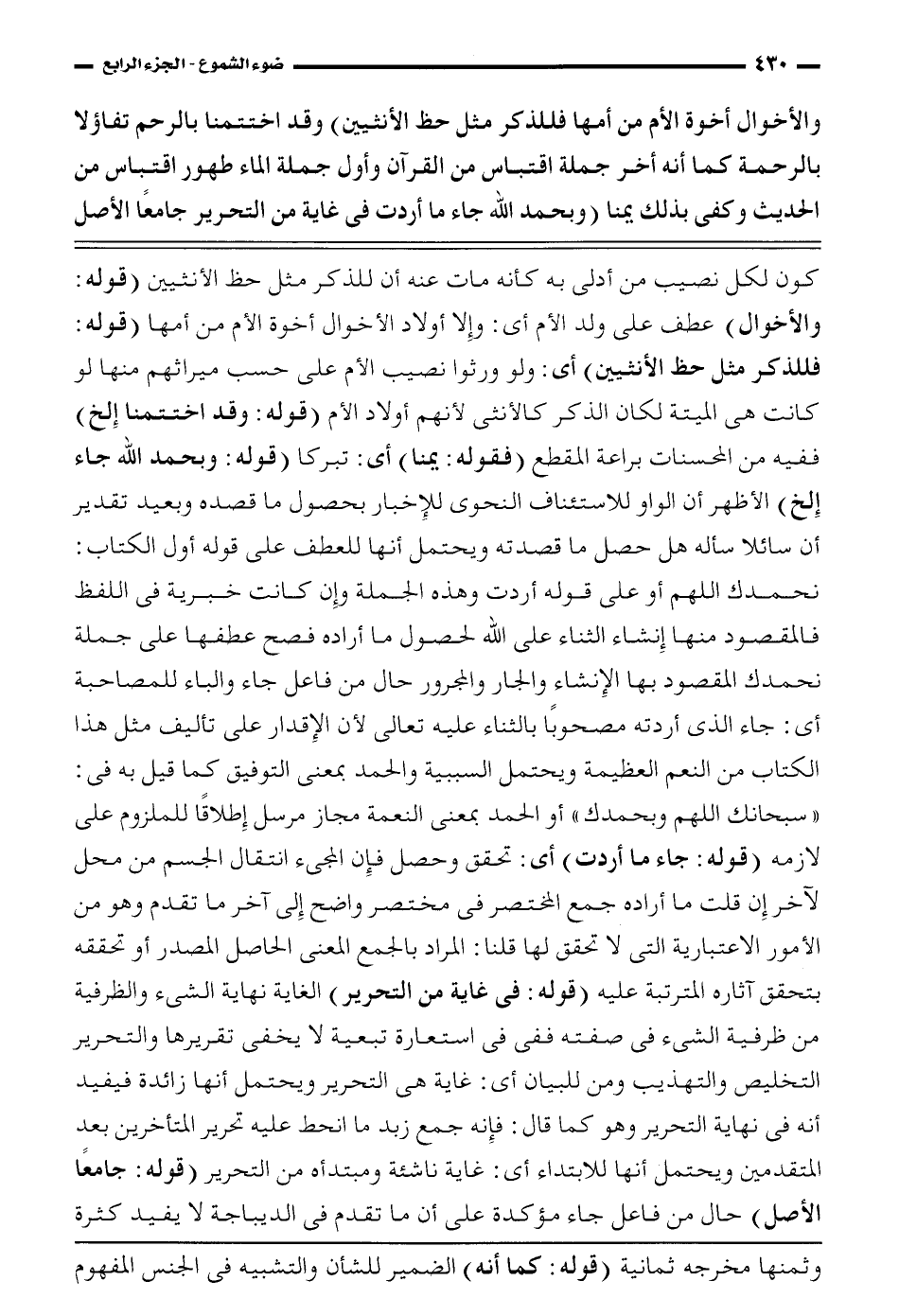 والأخوال أخوة الأم من أمها فللذكر مثل حظ الأنثيين) وقد اختتمنا بالرحم تفاؤلا بالرحمة كما أنه أخر جملة اقتباس من القرآن وأول جملة الماء طهور اقتباس من الحديث وكفى بذلك يمناً (وبحمد الله جاء ما أردت في غاية من التحرير جامعاً الأصل