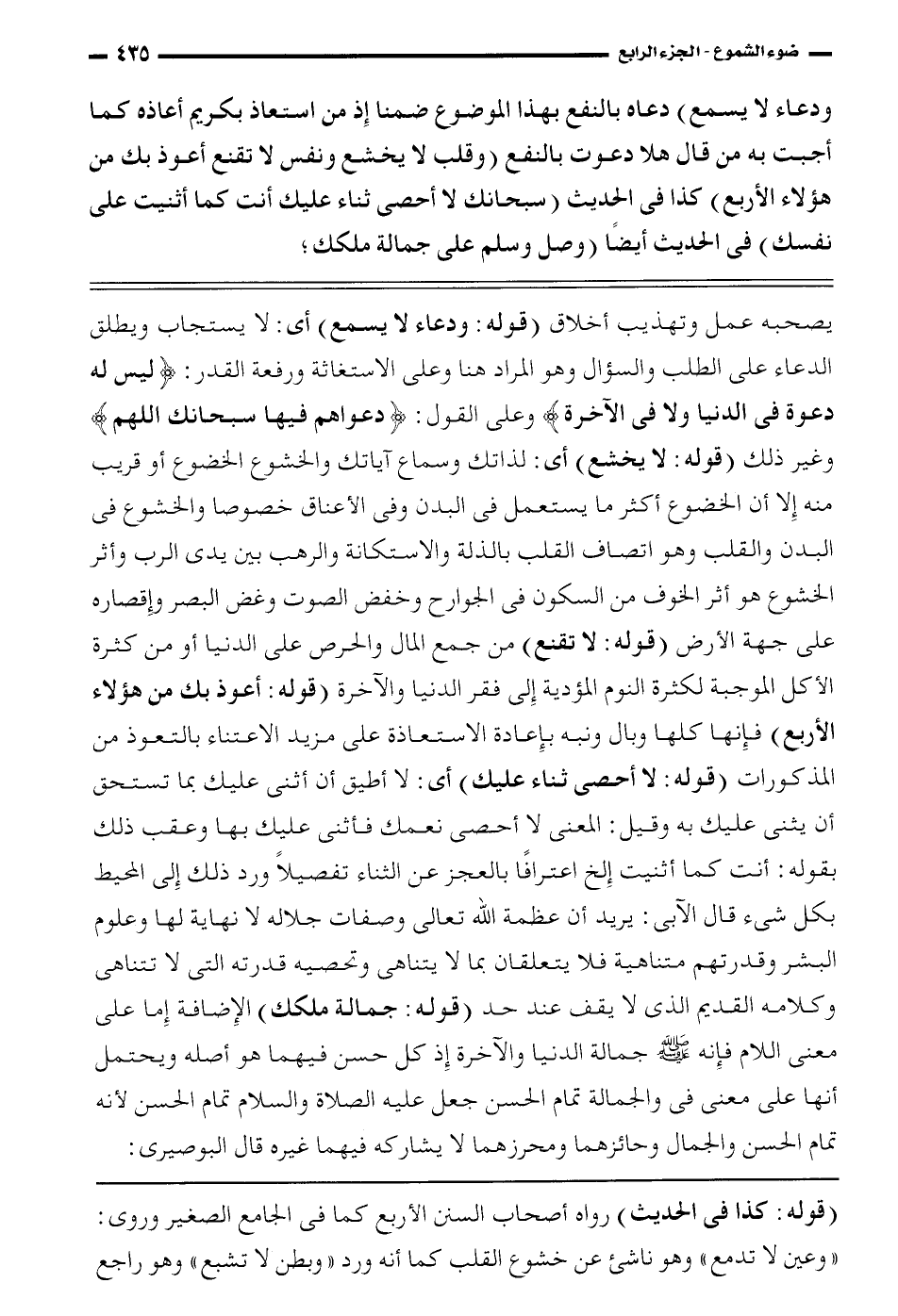 يصحبه عمل وتهذيب أخلاق (قوله: ودعاء لا يسمع) أي: لا يستجاب ويطلق الدعاء على الطلب والسؤال وهو المراد هنا وعلى الاستغاثة ورفعة القدر: {ليس له دعوة في الدنيا ولا في الآخرة} وعلى القول: {دعواهم فيها سبحانك اللهم} وغير ذلك (قوله: لا يخشع) أي: لذاتك وسماع آياتك والخشوع الخضوع أو قريب منه إلا أن الخضوع أكثر ما يستعمل في البدن وفي الأعناق خصوصاً والخشوع في البدن والقلب وهو اتصاف القلب بالذلة والاستكانة والرهب بين يدي الرب وأثر الخشوع هو أثر الخوف من السكون في الجوارح وخفض الصوت وغض البصر وإقصاره على جهة الأرض (قوله: لا تقنع) من جمع المال والحرص على الدنيا أو من كثرة الأكل الموجبة لكثرة النوم المؤدية إلى فقر الدنيا والآخرة (قوله: أعوذ بك من هؤلاء الأربع) فإنها كلها وبال بإعادة الاستعاذة على مزيد الاعتناء بالتعوذ من المذكورات (قوله: لا أحصى ثناء عليك) أي: لا أطيق أن أثنى عليك بما تستحق أن يثنى عليك به وقيل: المعنى لا أحصى نعمك فأثنى عليك بها وعقب ذلك بقوله: أنت كما أثنيت إلخ اعترافاً بالعجز عن الثناء تفصيلاً ورد ذلك إلى المحيط بكل شيء قال الآبي: يريد أن عظمة الله تعالى وصفات جلاله لا نهاية لها وعلوم البشر وقدرتهم متناهية فلا يتعلقان بما لا يتناهى وتحصيه قدرته التي لا تتناهى وكلامه القديم الذي لا يقف عند حد (قوله: جمالة ملكك) الإضافة إما على معنى اللام فإنه صلى الله عليه وسلم جمالة الدنيا والآخرة إذ كل حسن فيهما هو أصله ويحتمل أنها على معنى في والجمالة تمام الحسن جعل عليه الصلاة والسلام تمام الحسن لأنه تمام الحسن والجمال وحائزهما ومحرزهما لا يشاركه فيهما غيره قال البوصيري: