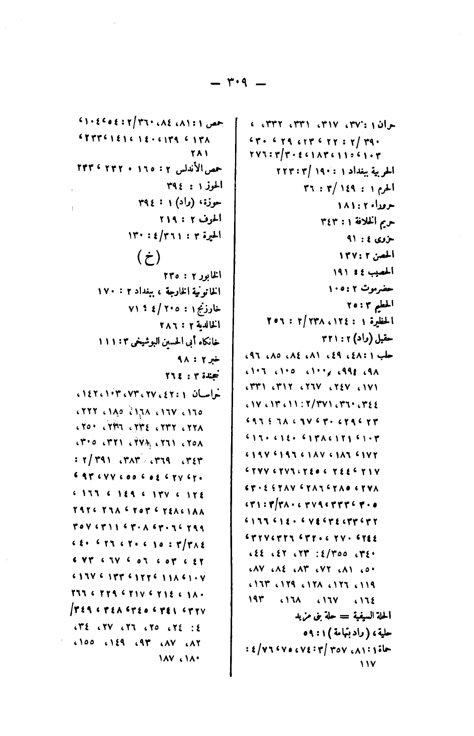 خراسان 1: 42، 27، 73، 103، 142، 165، 167، 168، 185، 222، 228، 232، 234، 236، 250، 258، 261، 271، 321، 305، 343، 369، 383، 391/ 2: