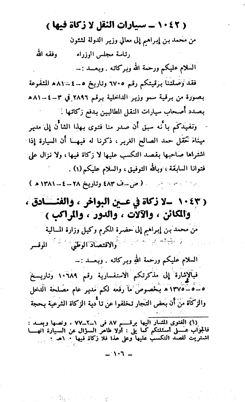 (¬1) الفتوى المشار إليها برقم 87 في 1 - 2 - 77، ونصها وبعد: فالجواب على اسئلتكم كما يلي: أولا ظاهر السؤال عن السيارة أنها اشتريت لقصد التكسب عليها وعلى هذا فلا زكاة فيها. أهـ.