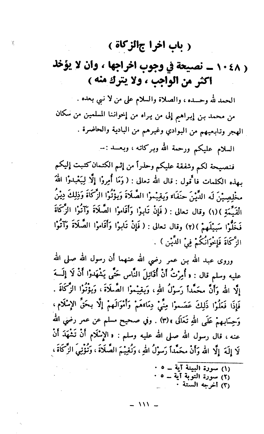 فنصيحة لكم وشفقة عليكم وحذراً من إثم الكتمان كتبت إليكم بهذه الكلمات فأقول: قال الله تعالى: (وما أمروا إلا ليعبدوا الله مخلصين له الدين حنفاء ويقيموا الصلاة ويؤتوا الزكاة وذلك دين القيمة) (¬1) وقال تعالى (فإن تابو وأقاموا الصلاة وآتوا الزكاة فخلوا سبيلهم) (¬2) وقال تعالى: (فإن تابوا وأقاموا الصلاة وآتوا الزكاة فأخوانكم في الدين) .