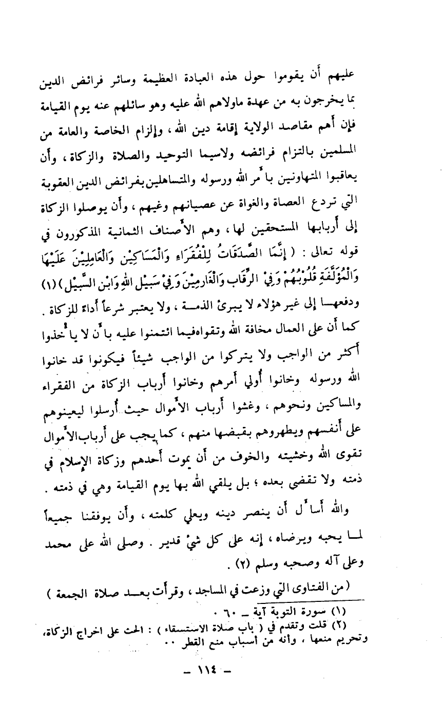 عليهم أن يقوموا حول هذه العبادة العظيمة وسائر فرائض الدين بما يخرجون به من عهدة ما ولاهم الله عليه وهو سائلهم عنه يوم القيامة فإن أهم مقاصد الولاية إقامة دين الله، وإلزام الخاصة والعامة من المسلمين بالتزام فرائضه ولاسيما التوحيد والصلاة والزكاة، وأن يعاقبوا المتهاونين بأمر الله ورسوله والمتساهلين بفرائض الدين العقوبة التي تردع العصاة والغواة عن عصيانهم وغيهم، وأن يوصلوا الزكاة إلى أربابها المستحقين لها، وهم الأصناف الثمانية المذكورون في قوله تعالى: (إنما الصدقات للفقراء والمساكين والعاملين عليها والمؤلفة قلوبهم وفي الرقاب والغارمين وفي سبيل الله وابن السبيل) (¬1) ودفعها إلى غير هؤلاء لا يبرئ الذمة، ولا يعتبر شرعاً أداء للزكاة.