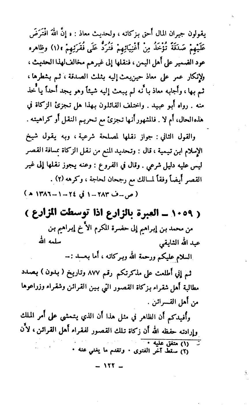 ثم إني أطلعت على مذكرتكم رقم 877 وتاريخ (بدون) بصدد مطالبة أهل شقراء بزكاة القصور التي بين القرائن وشقراء وزرعوها من أهل القرائن.