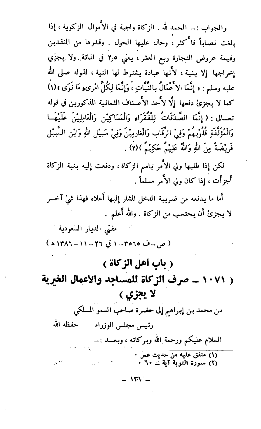 (1071 ـ صرف الزكاة للمساجد والأعمال الخيرية لا يجزي)