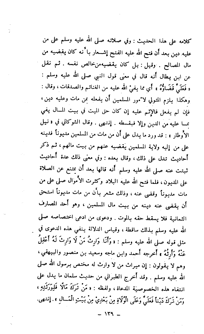 كلامه على هذا الحديث: وفي صلاته صلى الله عليه وسلم على من عليه دين بعد أن فتح الله عليه الفتح إشعار بأنه كان يقضيه من مال المصلح. وقيل: بل كان يقضيه من خالص نفسه. ثم نقل عن ابن بطال أنه قال في معنى قول النبي صلى الله عليه وسلم: " فعلى قضاؤه " أي مما يفي الله عليه من الغنائم والصدقات، وقال: وهكذا يلزم المتولي لأمور المسلمين أن يفعله بمن مات وعليه دين، فإن لم يفعل فالإثم عليه إن كان حق الميت في بيت المال يفي بما عليه من الدين وإلا فبقسطه إنتهى. وقال الشوكاني في " نيل الأوطار ": قد ورد مايدل على أن من مات من المسلمين مديوناً فدينه على من إليه ولاية المسلمين بقضيه عنهم من بيت مالهم، ثم ذكر أحاديث تدل على ذلك، وقال بعده: وفي معنى ذلك عدة أحاديث ثبتت عنه صلى الله عليه وسلم أنه قالها بعد أن يمتنع عن الصلاة على المديون، فلما فتح الله عليه البلاد وكثرت الأموال صلى على من مات مديوناً وقضى عنه، وذلك مشعر بأن من مات مديوناً استحق أن يقضي عنه دينه من بيت مال المسلمين، وهو أحد المصارف الثمانية فلا يسقط حقه بالموت.