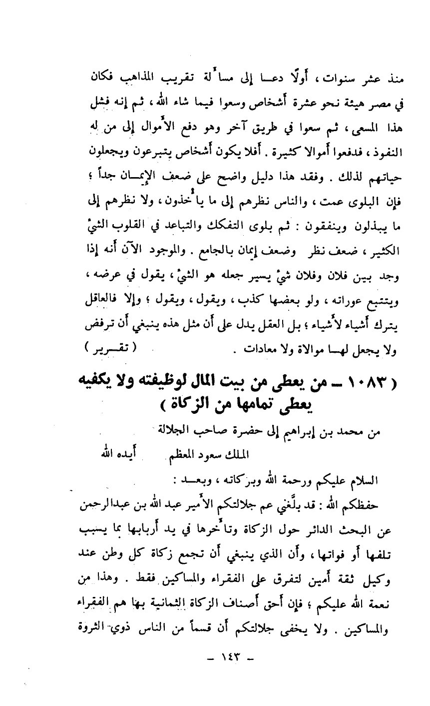 حفظكم الله: قد بلغني عم جلالتكم الأمير عبد الله بن عبد الرحمن عن البحث الدائر حول الزكاة وتأخرها في يد أربابها بما يسبب تلفها أو فواتها، وأن الذي ينبغي أن تجمع زكاة كل وطن عند وكيل ثقة أمين لتفرق على الفقراء والمساكين فقط. وهذا من نعمة الله عليكم؛ فإن أحق أصناف الزكاة الثمانية بها هم الفقراء والمساكين. ولا يخفى جلالتكم أن قسماً من الناس ذوي الثروة.