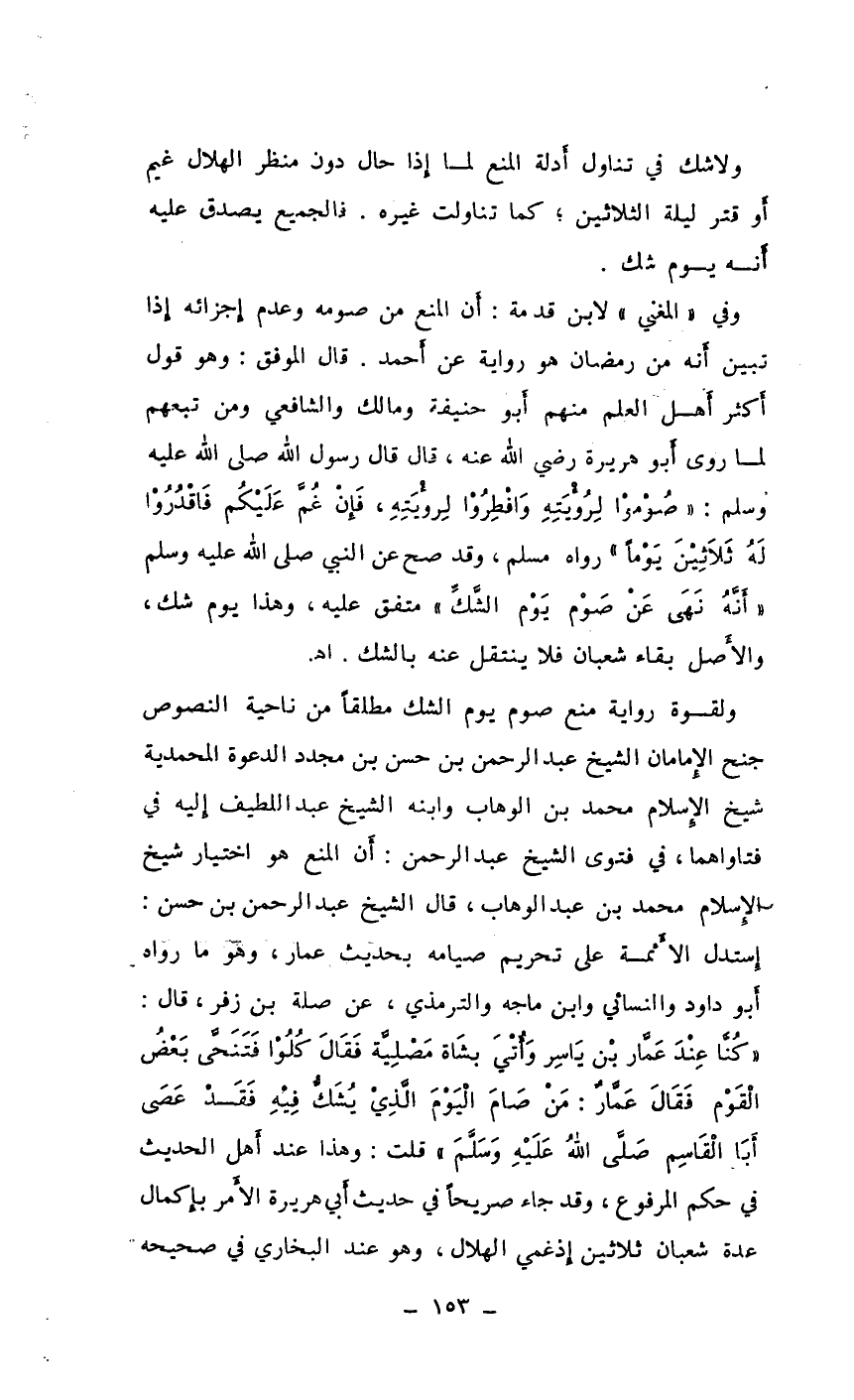 ولقوة رواية منع صوم يوم الشك مطلقاً من ناحية النصوص جنح الإمامان الشيخ عبد الرحمن بن حسن بن مجدد الدعوة المحمدية شيخ الإسلام محمد بن الوهاب وابنه الشيخ عبد اللطيف إليه في فتاواهما، في فتوى الشيخ عبد الرحمن: أن المنع هو اختيار شيخ الإسلام محمد بن عبد الوهاب، قال الشيخ عبد الرحمن بن حسن: إستدل الأئمة على تحريم صيامه بحديث عمار، وهو ما رواه أبو داود والنسائي وابن ماجه والترمذي، عن صلة بن زفر، قال: " كنا عند عمار بن ياسر وأتي بشاة مصلية فقال كلوا فتنحي بعض القوم فقال عمار: من صام اليوم الذي يشك فيه فقد عصى أبا القاسم صلى الله عليه وسلم " قلت: وهذا عند أهل الحديث في حكم المرفعون، وقد جاء صريحاً في حديث أبي هريرة الأمر بإكمال عدة شعبان ثلاثين إذغمي الهلال، وهو عند البخاري في صحيحة.