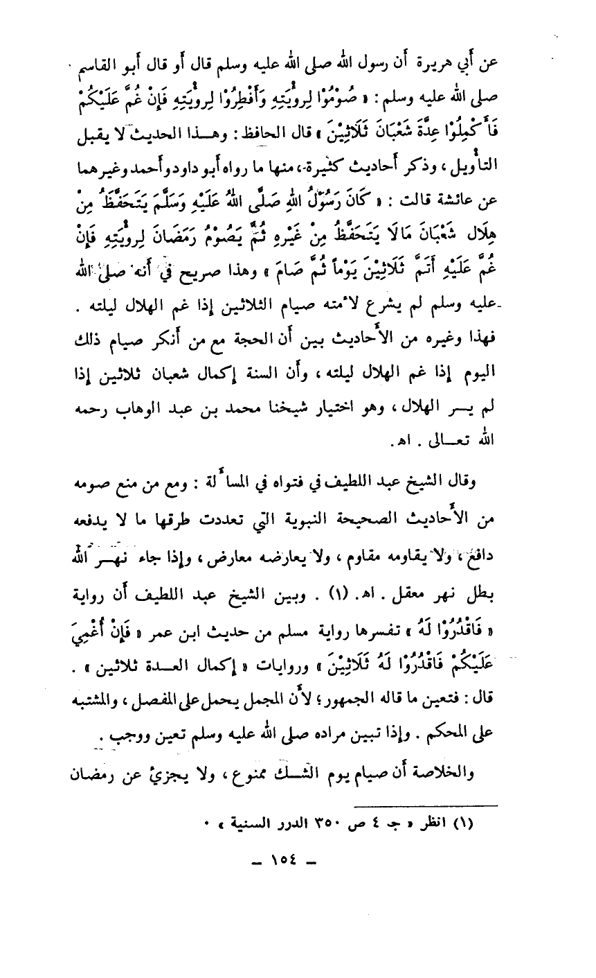 عن أبي هريرة أن رسول الله صلى الله عليه وسلم قال أو قال أبو القاسم صلى الله عليه وسلم: " صوموا لرؤيته وأفطروا لرويته فإن غم عليكم فأكملوا عدة شعبان ثلاثين " قال الحافظ: وهذا الحديث لا يقبل التأويل، وذكر أحاديث كثيرة، منها ما رواه أبو داود وأحمد وغيرهما عن عائشة قالت: " كان رسول الله صلى الله عليه وسلم يتحفظ من هلال شعبان مالا ما لا يتحفظ من غيره ثم يصوم رمضان لرويته فإن غم عليه أتم ثلاثين يوماً ثم صام " وهذا صريح في أنه صلى الله عليه وسلم لم يشرع لأمته صيام الثلاثين إذا غم الهلال ليلته فهذا وغيره من الأحاديث بين أن الحجة مع من أنكر صيام ذلك اليوم إذا غم الهلال، وأن السنة إكمال شعبان ثلاثين إذا لم يسر الهلال، وهو اختيار شيخنا محمد بن عبد الوهاب رحمه الله تعالى. أهـ.