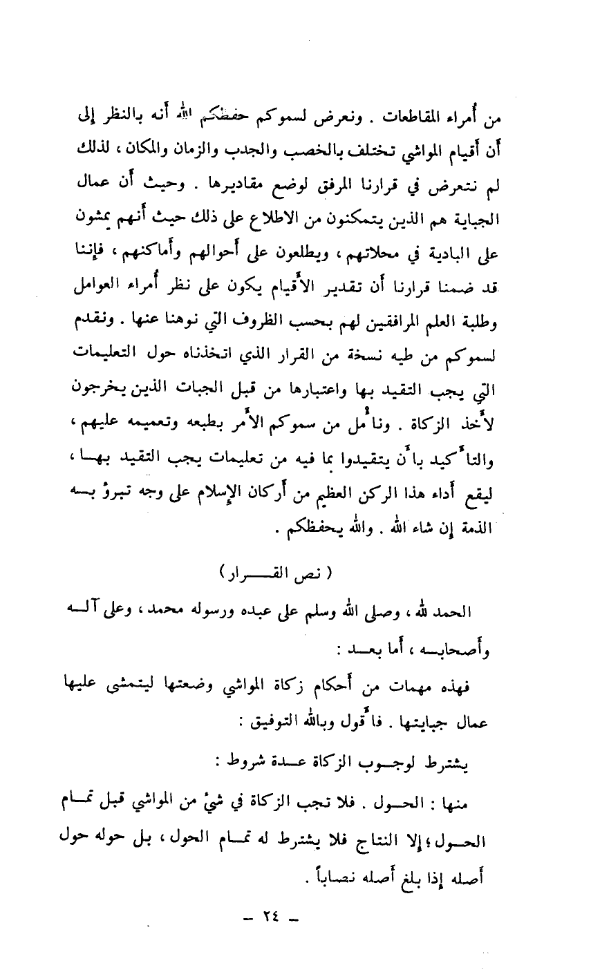 من أمراء المقاطعات ونعرض لسموكم حفظكم الله أنه بالنظر إلى أن أقيام المواشي تختلف بالخصب والجدب والزمان والمكان، لذلك لم نتعرض في قرارنا المرفق لوضع مقاديرها وحيث أن عمال الجباية هم الذين يتمكنون من الإطلاع على ذ ... لك حيث أنهم يمشون على البادية في محلاتهم، ويطلعون على أحوالهم وأماكنهم، فإننا قد ضمنا قرارنا أن تقدير الأقيام يكون على نظر أمراء العوامل وطلبه العلم المرافقين لهم بحسب الظروف التي نوهنا عنها ونقدم لسموكم من طيه نسخة من القرار الذي اتخذناه حول التعليمات التي يجب التقيد بها واعتبارها من قبل الجبات الذين يخرجون لأخذ الزكاة ونأمل من سموكم الأمر بطبعه وتعميه عليه، والتأكيد بأن يتقيدوا بما فيه من تعليمات يجب التقيد بها، ليقع أداء هذا الركن العظيم من أركان الإسلام على وجه تبرؤ به الذمة إن شاء الله. والله يحفظكم.