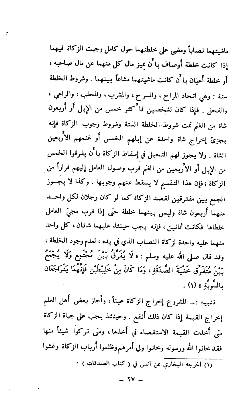 ماشيتها نصاباً ومضى على خلطتهما حول كامل وجبت الزكاة فيهما إذا كانت خلطة أو صاف بأن يميز مال كل منهما عن مال صاحبه، أو خلطة أعيان بأن كانت ماشيتها مشاعاً بينهما. وشروط الخلطة ستة: وهي اتحاد المراح، والمسرح، والمشرب، والمحلب، والراعي، والفجل. فإذا كان لشخصين فأكثر خمس من الإبل أو أربعون شاة من الغنم تمت شروط الخلطة الستة وشروط وجوب الزكاة فأن يجزئ إخراج شاة واحدة عن إبلهم الخمس أو غنمهم الأربعين الشاة ولا يجوز لهم التحيل في إسقاط الزكاة بأن يفرقوا الخمس من الإبل أو الأربعين من الغنم قرب وصول العامل إليهم فراراً من الزكاة، فإن هذا التقسيم لا يقسط عنهم وجوبها. وكذا لا يجوز الجمع بين مفترقين لقصد الزكاة كما لو كان رجلان لكل واحد منهما أربعون شاه وليس بينهما خلطة حتى إذا قرب مجيء العامل خلطاها فكانت ثمانين، فإنه يجب حينئذ عليهما شاتان، كل واحد منهما عليه واحدة لزكاة النصاب الذي في يده، لعدم وجود الخلطة، وقد قال صلى الله عليه وسلم الله عليه وسلم: " لا يفرق بين مجتمع ولا يجمع بين متفرق خشية الصدقة، وما كان من خليطين فأنهما يتراجعان بالسوية " (¬1) .