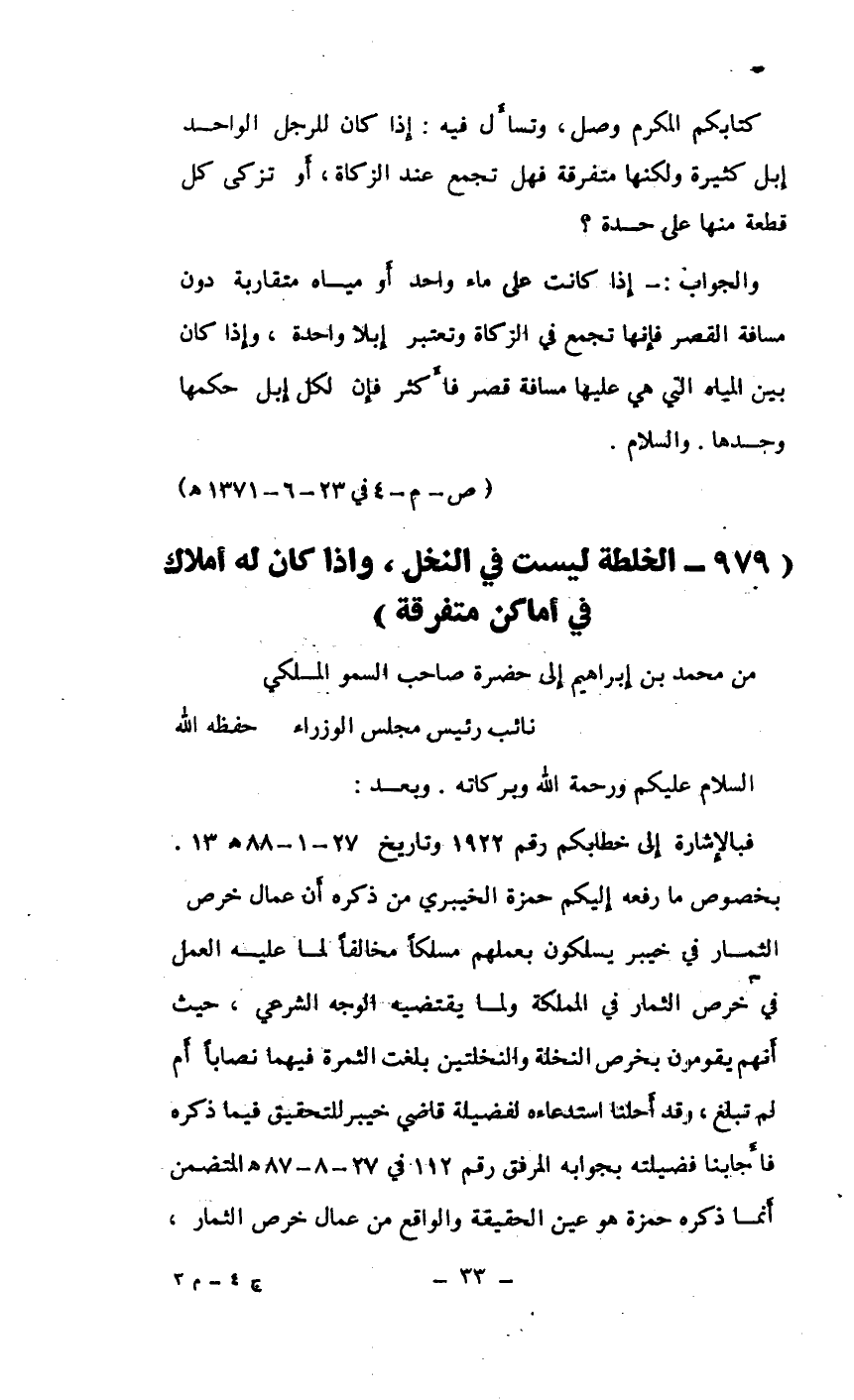 فبالإشارة إلى خطابكم رقم 1922 وتاريخ 27/1/1388هـ بخصوص مارفعه إليكم حمزة الخيبري من ذكره أن عمال خرص الثمار في خيبر يسلكون بعملهم مسلكاً مخالفاً لما عليه العمل في خرص الثمار في المملكة ولما يقتضيه الوجه الشرعي، حيث أنهم يقومون بخرص النخلة والنخلتين بلغت الثمرة فيهما نصاباً أم لم تبلغ، وقد أحلنا استدعاءه لفضيلة قاضي خيبر للتحقيق فيما ذكره فأجابنا فضيلته بجوابه المرفق رقم 112 في 27/8/87هـ المتضمن أنما ذكره حمزة هو عين الحقيقة والواقع من عمال خرص الثمار