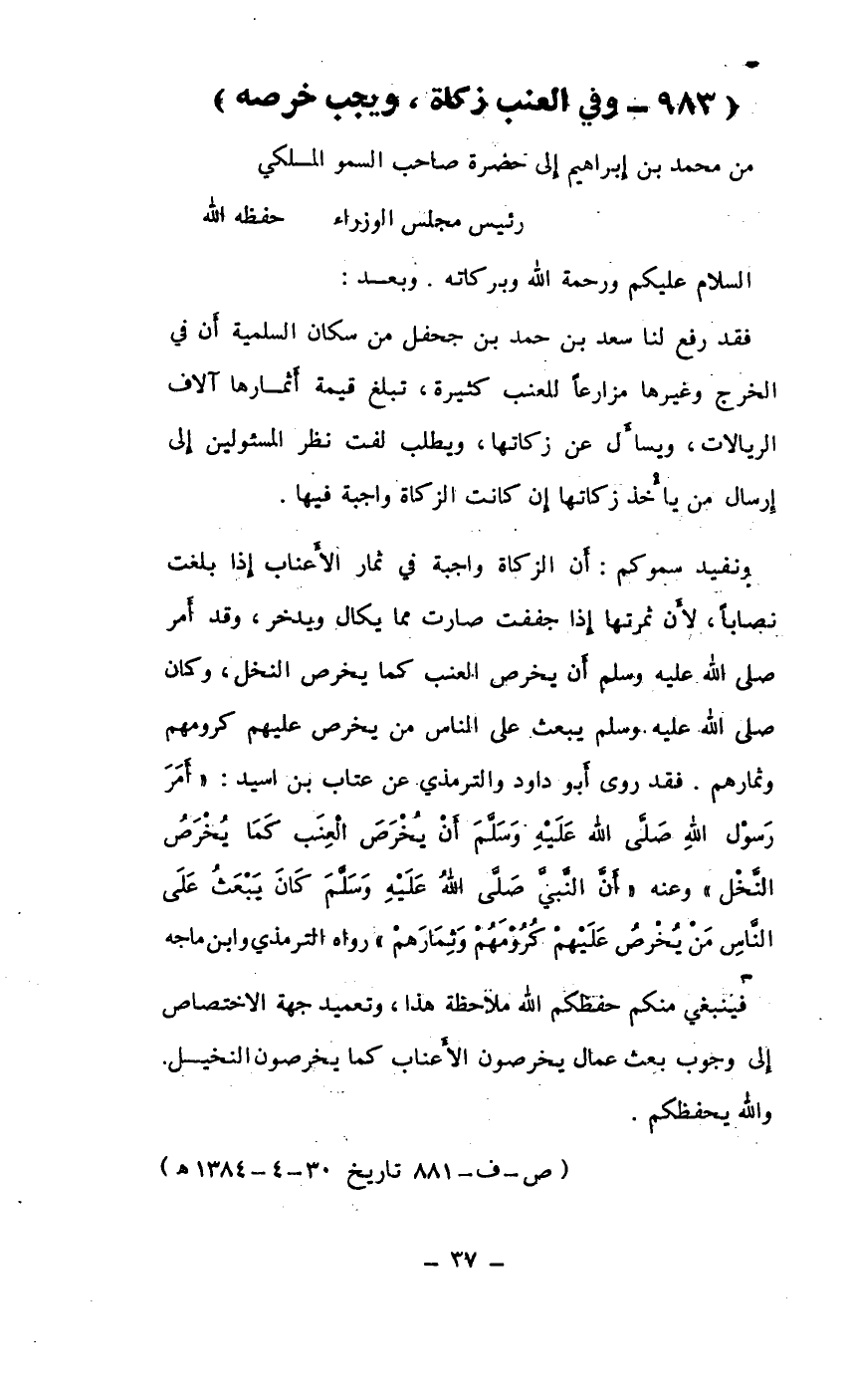 ونفيد سموكم: أن الزكاة واجبة في ثمار الأعناب إذ بلغت نصاباً، لأن ثمرتها إلا جففت صارت مما يكال ويدخر، وقد أمر صلى الله عليه وسلم أن يخرص العنب كما يخرص النخل، وكان صلى الله عليه وسلم يبعث على الناس من يخرص عليهم كرومهم وثمارهم. فقد روى أبو داود والترمذي عن عتاب بن اسيد: "أمر رسول الله صلى الله عليه وسلم أن يخرص العنب كما يخرص النخل" وعنه "أن النبي صلى الله عليه وسلم كان يبعث على الناس من يخرص عليهم كرومهم وثمارهم" رواه الترمذي وابن ماجه فينبغي منكم حفظكم الله ملاحظة هذا، وتعميد جهة الاختصاص إلى وجوب بعث عمال يخرصون الأعناب كما يخرصون النخيل. والله يحفظكم.