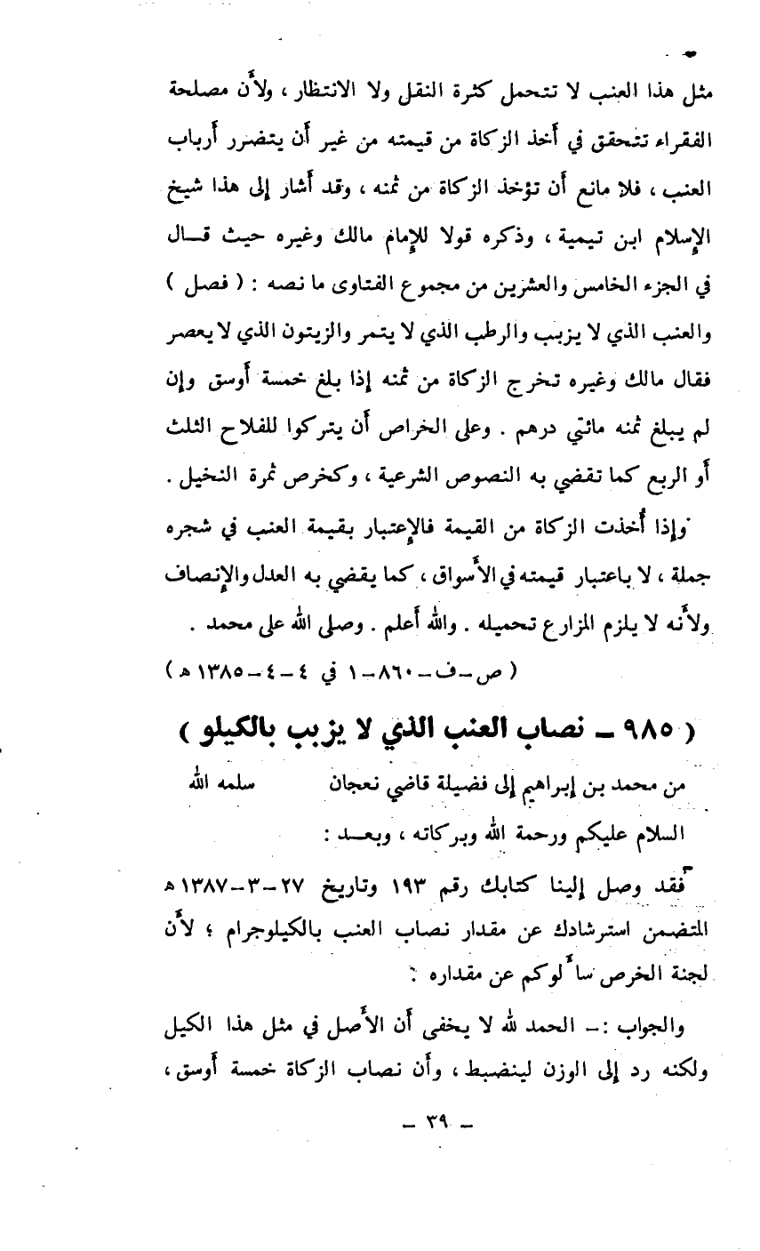 فقد وصل إلينا كتابك رقم 193 وتاريخ 27-3-1387هـ المتضمن استرشادك عن مقدار نصاب العنب بالكيلوجرام؛ لأن لجنة الخرص سألوكم عن مقداره.