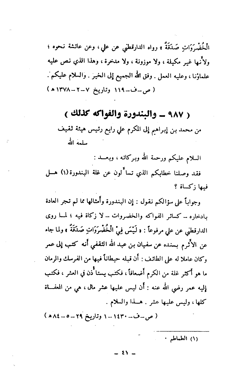 فقد وصلنا خطابكم الذي تسألون عن غلة البندورة (¬1) هل فيها زكاة؟