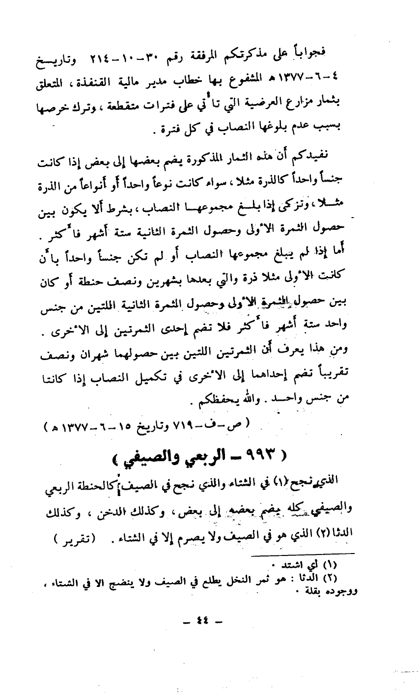 فجواباً على مذكرتكم المرفقة رقم 30 - 10 - 214 وتاريخ 4-6-1377هـ المشفوع بها خطاب مدير مالية القنفذة، المتعلق بثمار مزارع العرضية التي تأتي على فترات متقطعة، وترك خرصها بسبب عدم بلوغها النصاب في كل فترة.