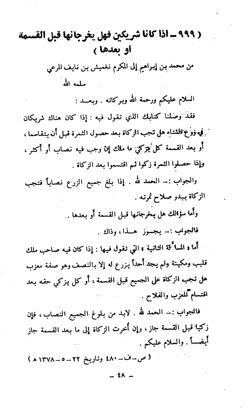 فقد وصلنا كتابك الذي تقول فيه: إذا كان هناك شريكان في زرع الشتاء هل تجب الزكاة بعد حصول الثمرة قبل أن يتقاسما، أو بعد القسمة كل يزكي ما ملك إن وجب فيه نصاب أو أكثر. وإذا حصلوا الثمرة زكوا ثم اقتسموا بعد الزكاة.