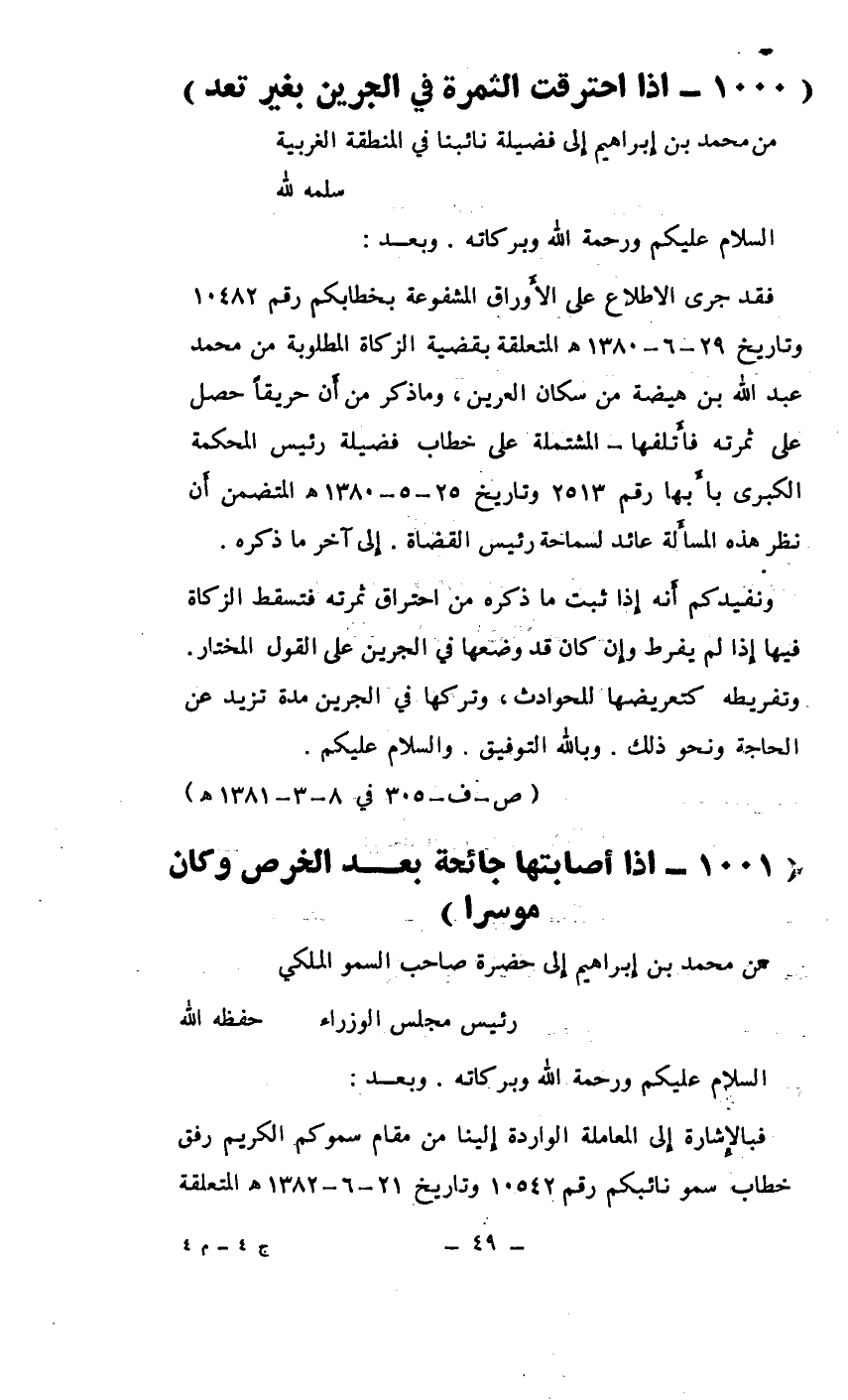 فقد جرى الاطلاع على الأوراق المشفوعة بخطابكم رقم 10482 وتاريخ 29-6-1380هـ المتعلقة بقضية الزكاة المطلوبة من محمد عبد الله بن هيضة من سكان العرين، وما ذكر من أن حريقاً حصل على ثمرته فأتلفها - المشتملة على خطاب فضيلة رئيس المحكمة الكبرى بأبها رقم 2513 وتاريخ 25 - 5 - 1380هـ المتضمن أن نظر هذه المسألة عائد لمساحة رئيس القضاة. إلى آخر ما ذكره.