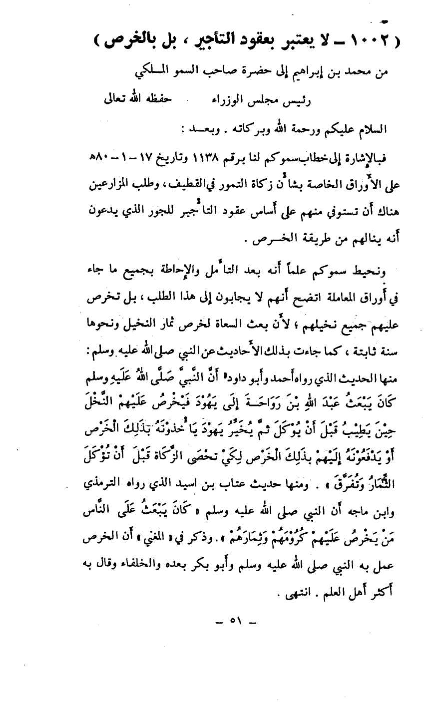 فبالإشارة إلى خطاب سموكم لنا برقم 1138 وتاريخ 17-1-80هـ على الأوراق الخاصة بشأن زكاة التمور في القطيف، وطلب المزارعين هناك أن تستوفي منهم على أساس عقود التأجير للجور الذي يدعون أنه ينالهم من طريق الخرص.