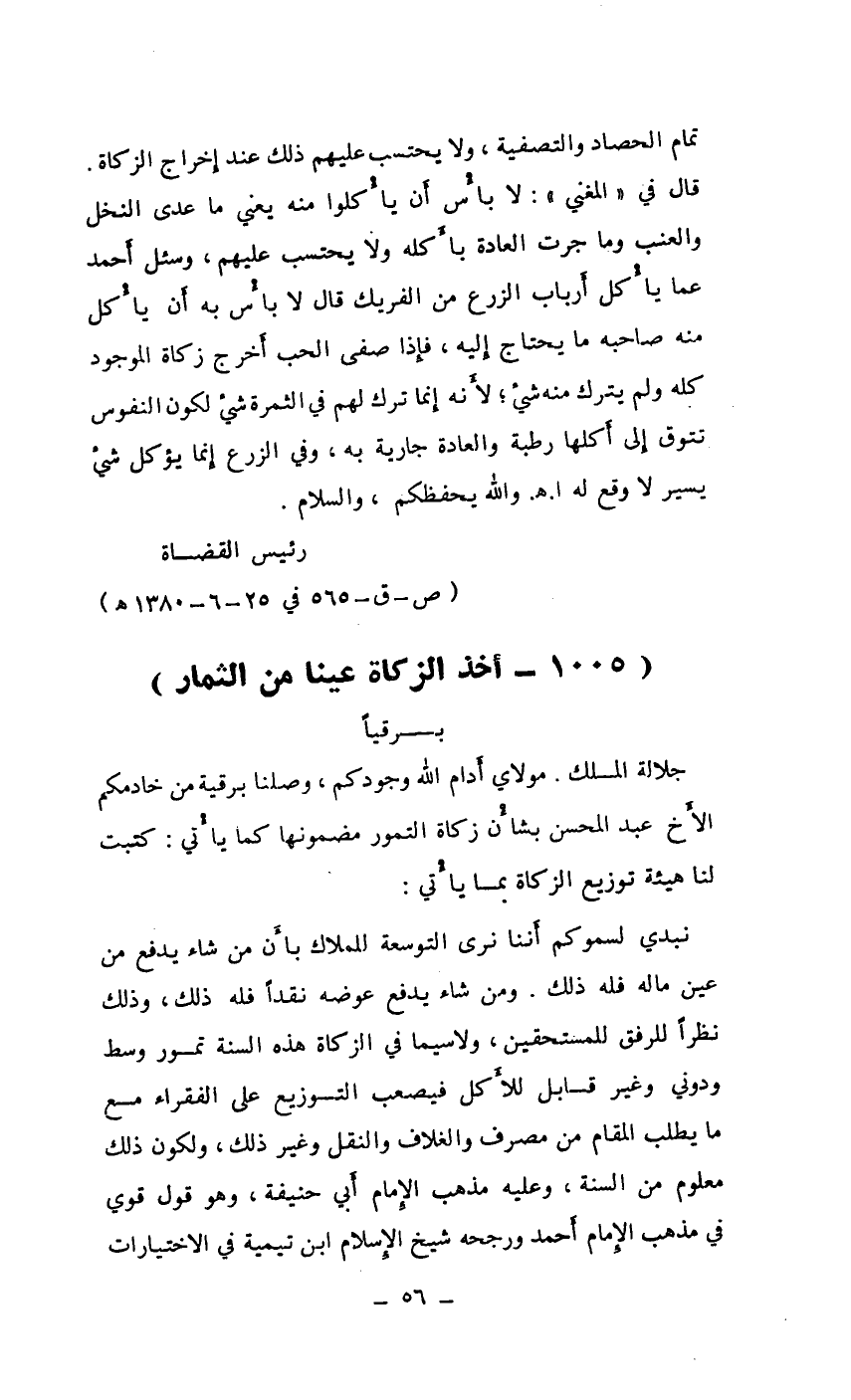 جلالة الملك. مولاي أدام الله وجودكم، وصلنا برقية من خادمكم الأخ عبد المحسن بشأن زكاة التمور مضمونها كما يأتي: كتبت لنا هيئة توزيع الزكاة بما يأتي: