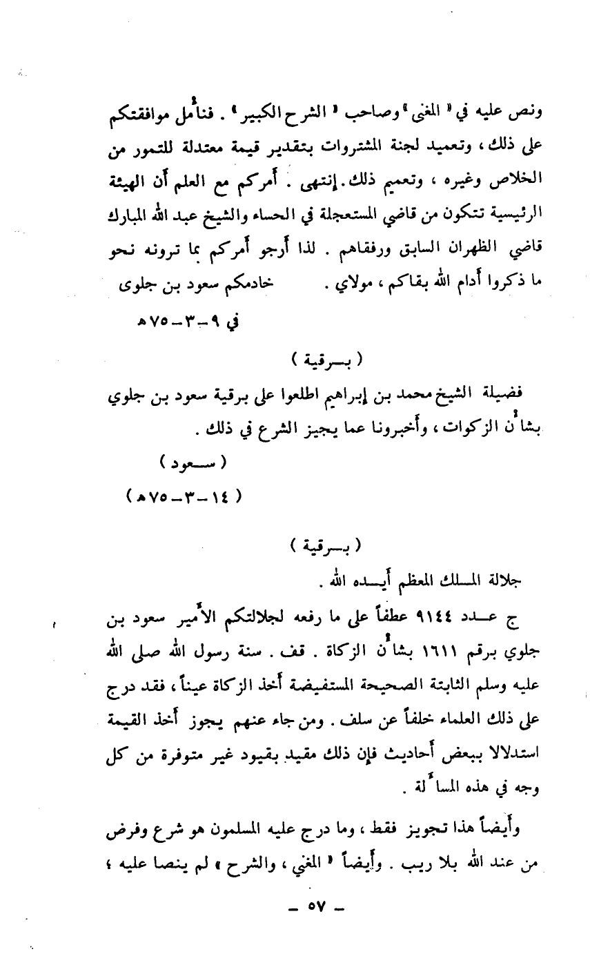 ونص عليه في "المغني" وصاحب "الشرح الكبير". فنأمل من موافقتكم على ذلك، وتعميد لجنة المشتروات بتقدير قيمة معتدلة للتمور من الخلاص وغيره، وتعميم ذلك. وإنتهى. أمركم مع العلم أن الهيئة الرئيسية تتكون من قاضي المستعجلة في الحساء والشيخ عبد الله المبارك قاضي الظهران السابق ورفقاهم. لذا أرجو أمركم بما ترونه نحو ما ذكروا أدام الله بقاكم، مولاي. خادمكم سعود بن جلوي