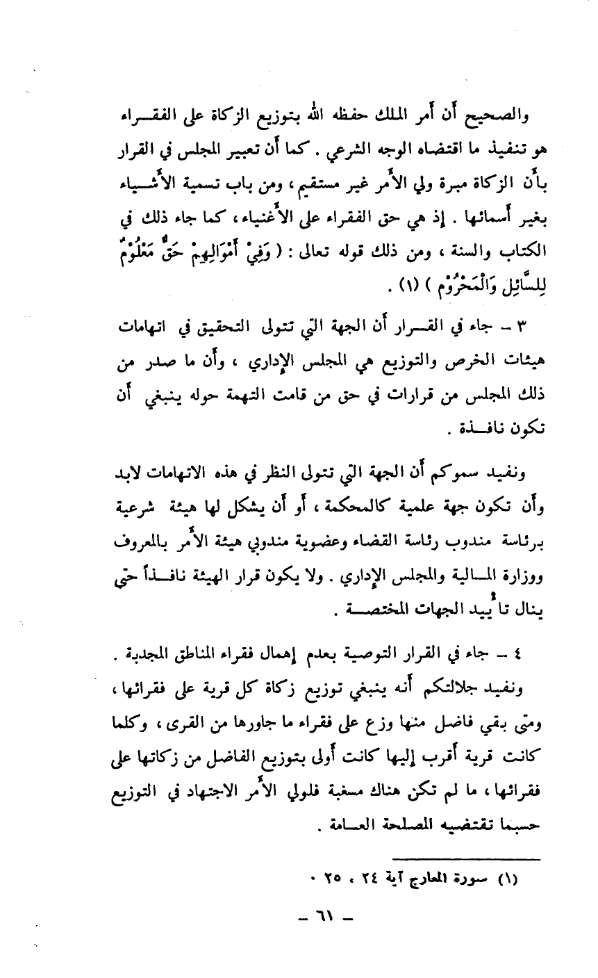 4- جاء في القرار التوصية بعدم إهمال فقراء المناطق المجدبة. ونفيد جلالتكم أنه ينبغي توزيع زكاة كل قرية على فقرائها، ومتى بقي فاضل منها وزع على قراء ما جاورها من القرى، وكلما كانت قرية أقرب إليها كانت أولى بتوزيع الفاضل من زكاتها على فقرائها، ما لم تكن هناك مسغبة فولي الأمر الاجتهاد في التوزيع حسبما تقتضيه المصلحة العامة.