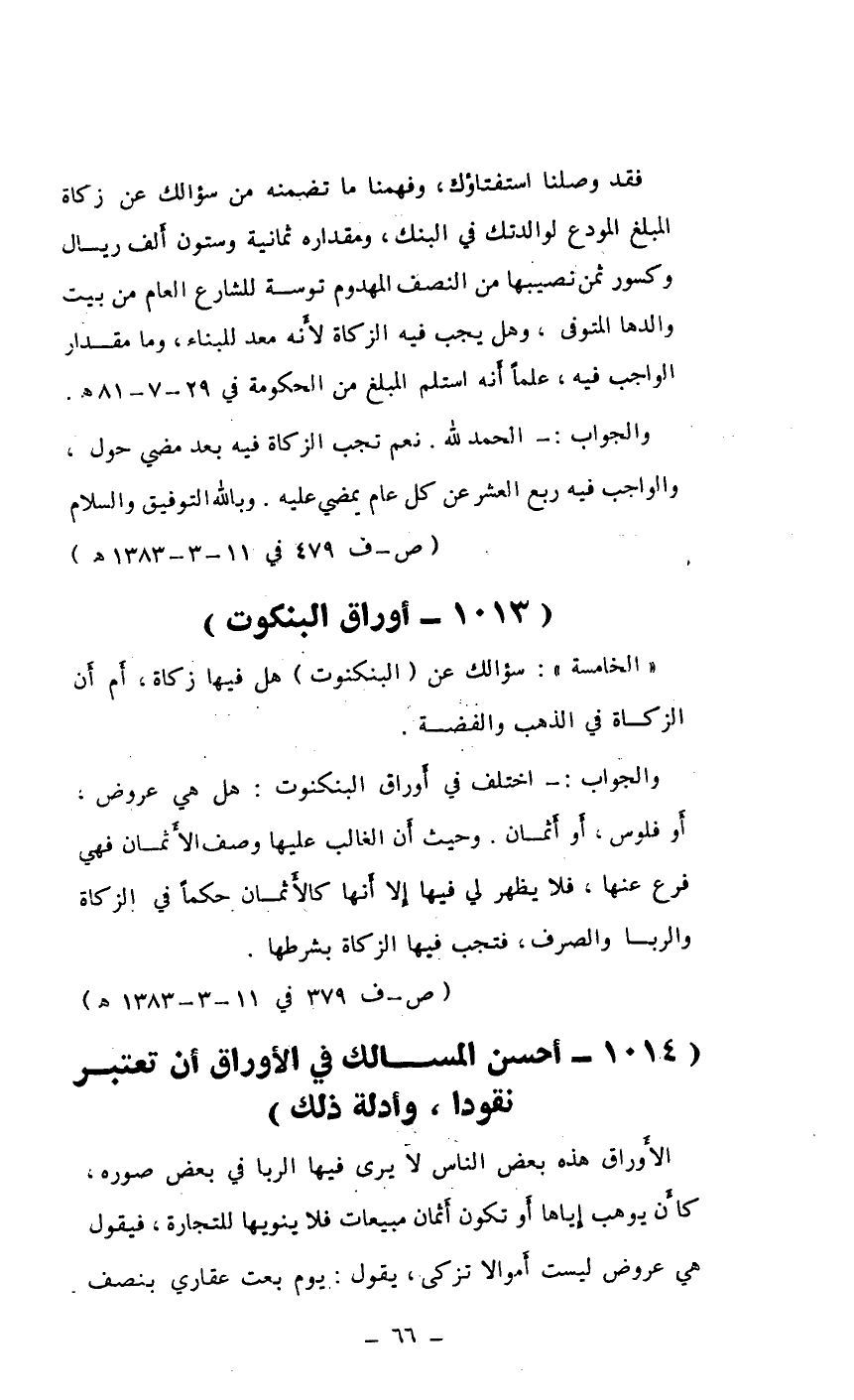 والجواب: اختلف في أوراق البنكنوت: هل هي عروض أو فلوس، أو أثمان. وحيث أن الغالب عليها /صف الأثمان فهي فرع عنها، فلا يظهر لي فيها إلا أنها كالأثمان حكماً في الزكاة والربا والصرف، فتجب فيها الزكاة بشرطها.