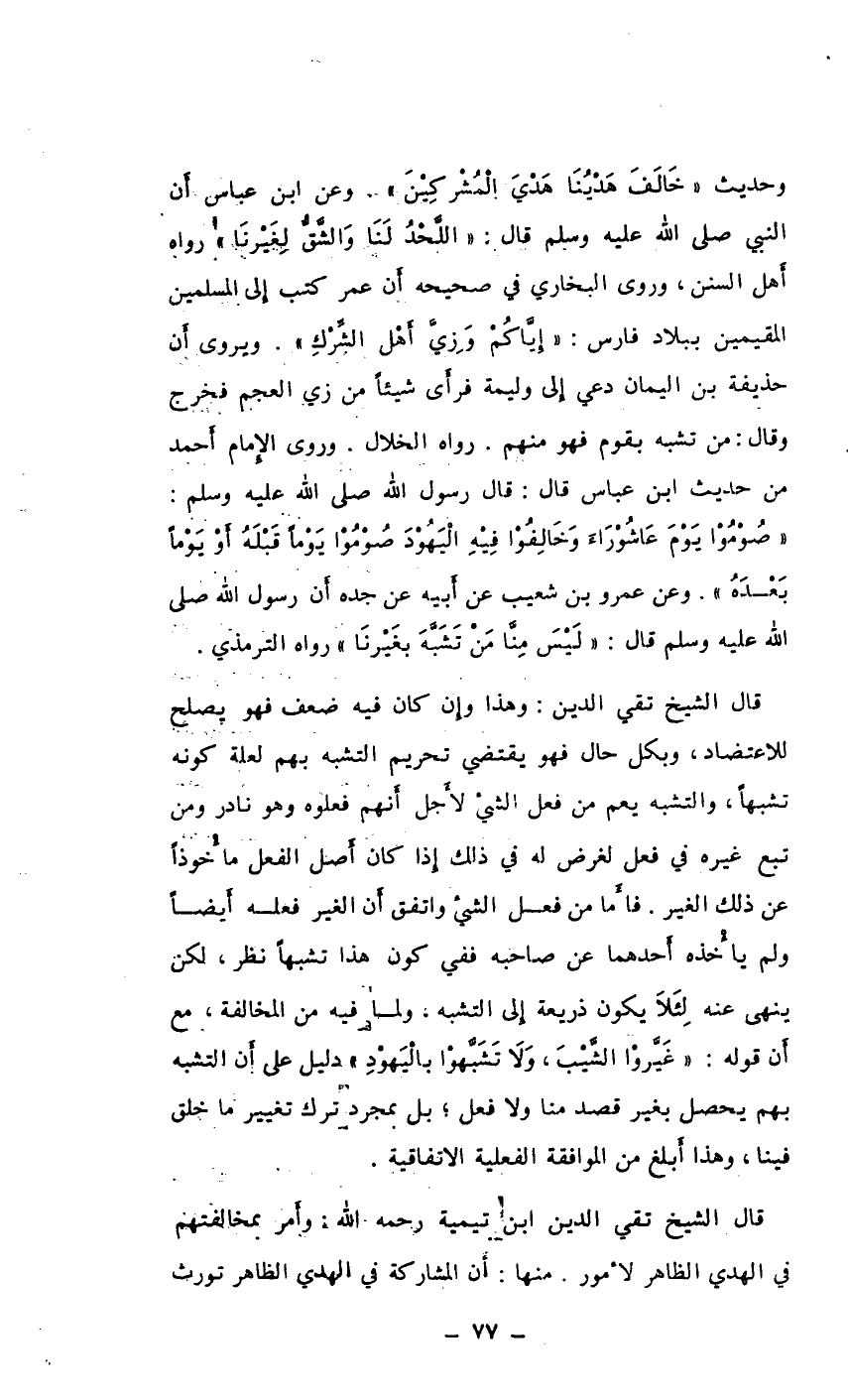 قال الشيخ تقي الدين: وهذا وإن كان فيه ضعف فهو يصلح للاعتضاد، وبكل حال فهو يقتضي تحريم التشبه بهم لعلة كونه تشبهاً، والتشبه يعم من فعل الشيء لأجل أنهم فعلوه وهو نادر ومن تبع غيره في فعل لغرض له في ذلك إذا كان أصل الفعل مأخوذاً عن ذلك الغير. فأما من فعل الشيء واتفق أن الغير فعله أيضاً ولم يأخذه أحدهما عن صاحبه ففي كون هذا تشبهاً نظر، لكن ينهي عنه لئلا يكون ذريعة إلى التشبه، ولما فيه من المخالفة، مع أن قوله: " غيروا الشيب، ولا تشبهوا باليهود " دليل على أن التشبه بهم يحصل بغير قصد منا ولافعل؛ بل بمجرد ترك تغيير ماخلق فينا، وهذا أبلغ من الموافقة الفعلية الاتفاقية.