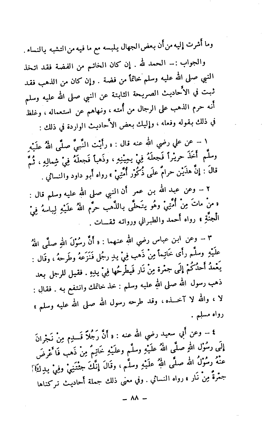 4 - وعن أبي سعيد رضي الله عنه: " أن رجلا قدم من نجران إلى رسول الله صلى الله عليه وسلم وعليه خاتم من ذهب فأعرض عنه رسول الله صلى الله عليه وسلم، وقال إنك جئتني وفي يدك جمرة من نار " رواه النسائي. وفي معنى ذلك جملة أحاديث تركناها