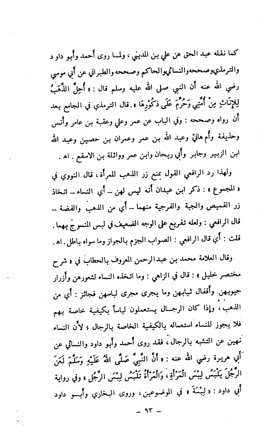 كما نقله عبد الحق عن علي بن المديني، ولما روى أحمد وأبو داود والترمذي وصححه والنسائي والحاكم وصححه والطبراني عن أبي موسى رضي الله عنه أن النبي صلى الله عليه وسلم قال: أحل الذهب للإناث من أمتي وحرم على ذكورها ". قال الترمذي في الجامع بعد أن رواه وصححه: وفي الباب عن عمر وعلي وعقبة بن عامر وأنس وحذيفة وأم هانئ وعبد الله بن عمر وعمران بن حصين وعبد الله ابن الزبير وجابر وأبي ريحان وابن عمر ووائلة بن الأسقع. أهـ.