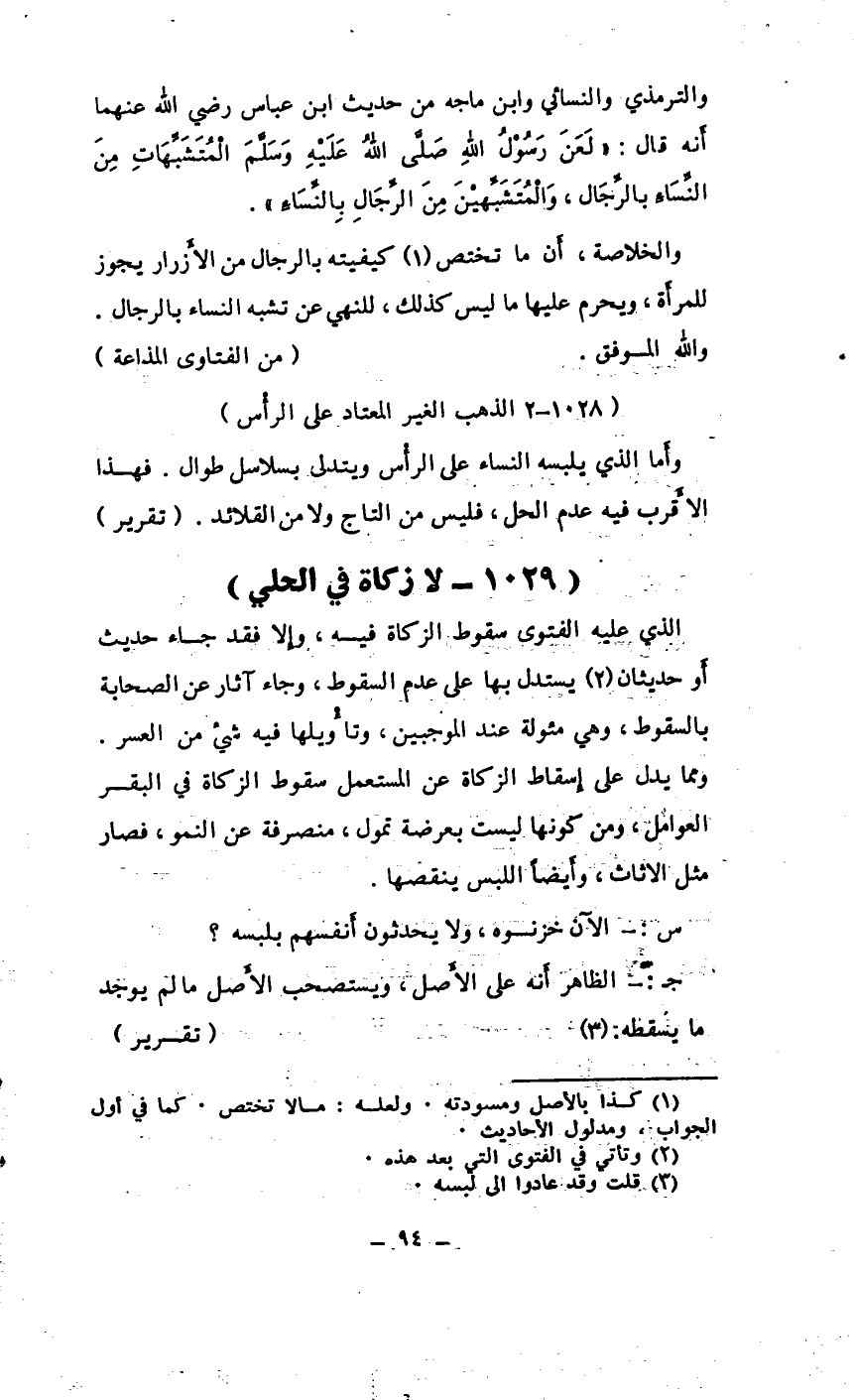 والخلاصة، أن ما تختص (¬1) كيفيته بالرجال من الأزرار يجوز للمرأة، ويحرم عليها ما ليس كذلك، للنهي عن تشبه النساء بالرجال والله الموفق.