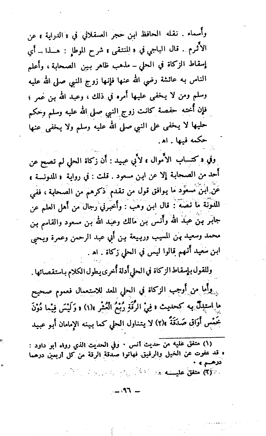 وأسماء. نقله الحافظ ابن حجر العسقلاني في " الدراية " عن الأثرم. قال الباجي في " المنتقى " شرح الموطأ: هذا أي إسقاط الزكاة في الحلي ـ مذهب ظاهر بين الصحابة، وأعلم الناس به عائشة رضي الله عنها فإنها زوج النبي صلى الله عليه وسلم ومن لا يخفى عليها أمره في ذلك، وعبد الله بن عمر؛ فإن أخته حفصة كانت زوج النبي صلى الله عليه وسلم وحكم حليها لا يخفى على النبي صلى الله عليه وسلم ولا يخفى عنها حكمه فيها. أهـ.